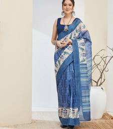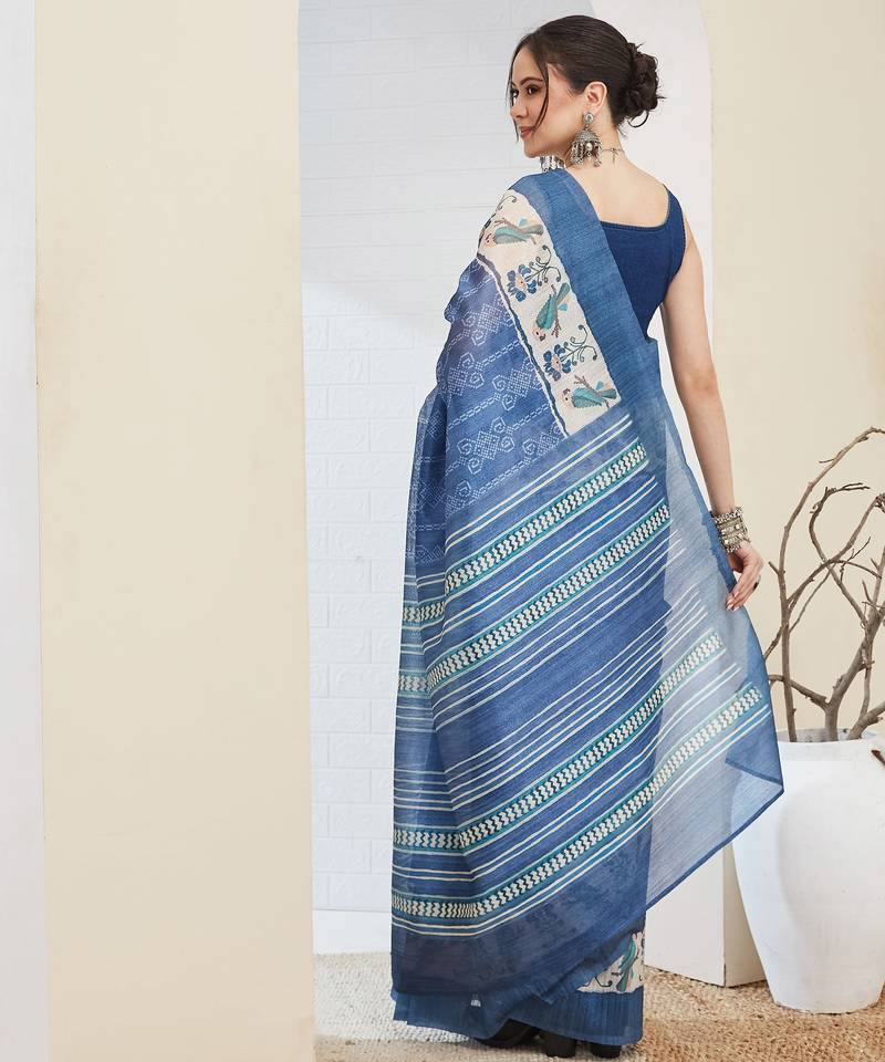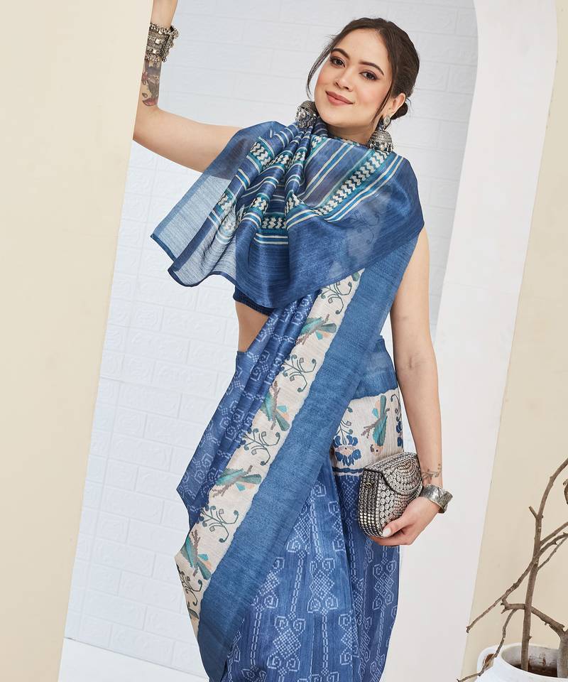 Blue color silk blended designer digital printed partywear saree