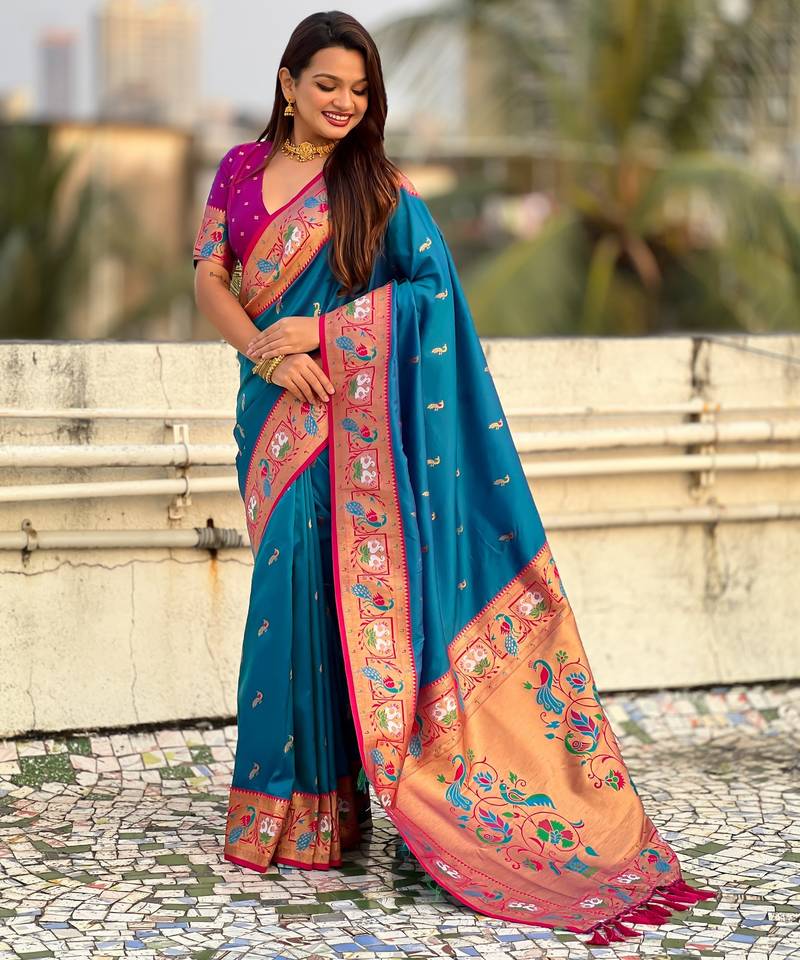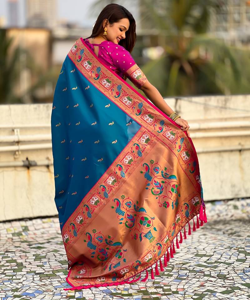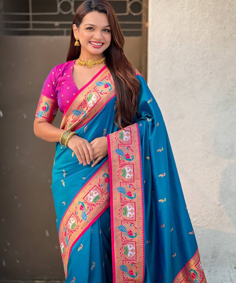 Blue color sophisitcated paithani silk saree with meenakari woven designer