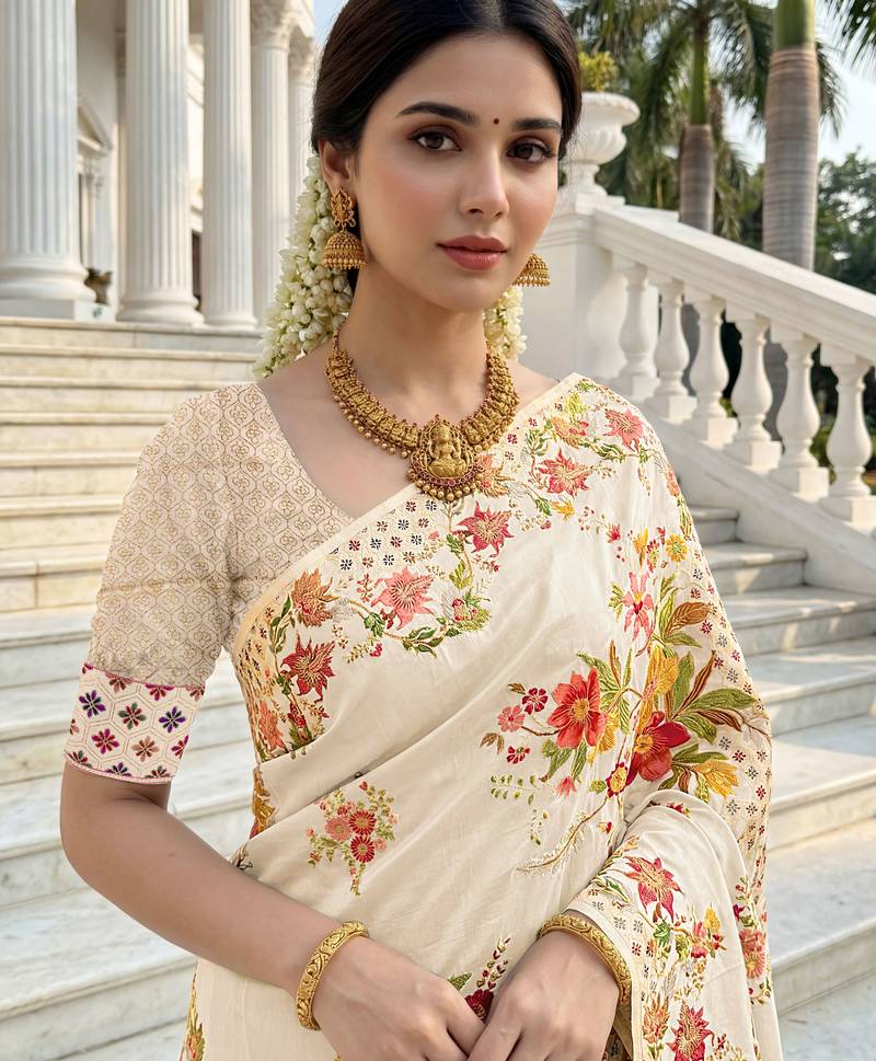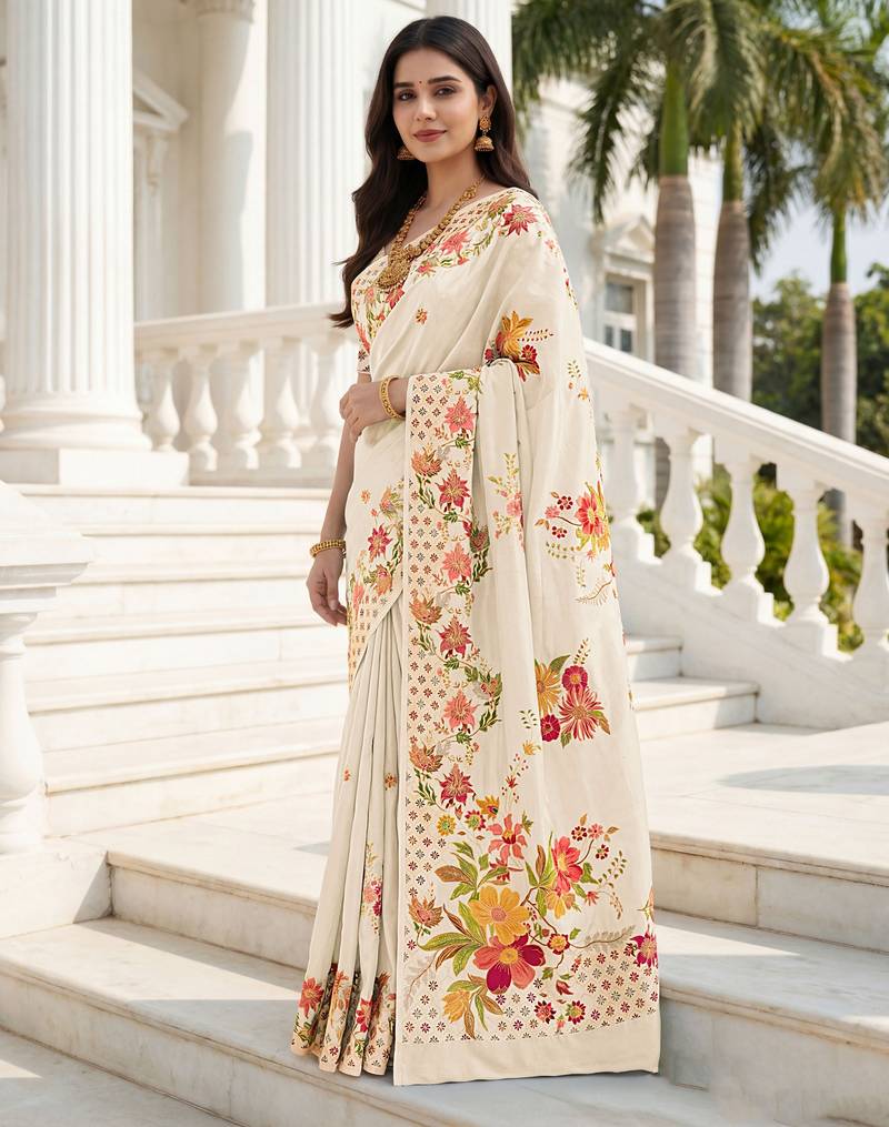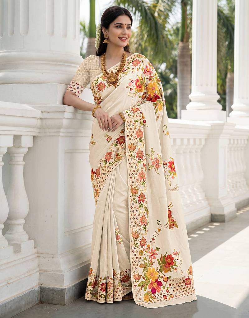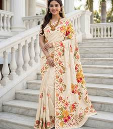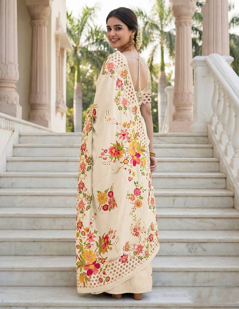 Cream color beautiful russian silk floral position printed work saree
