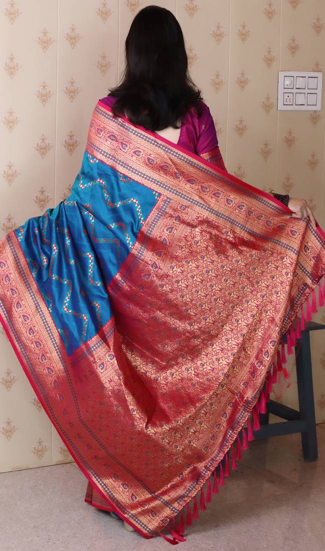Firozi color banarasi silk blend fabric woven designer traditional saree