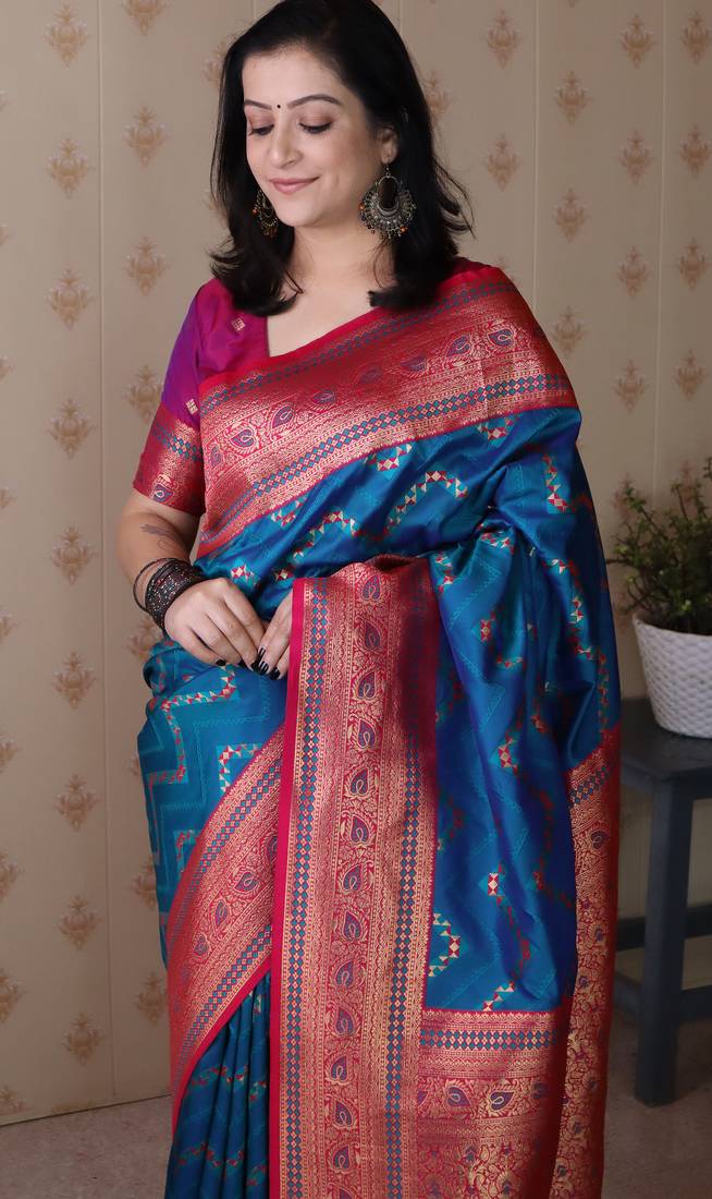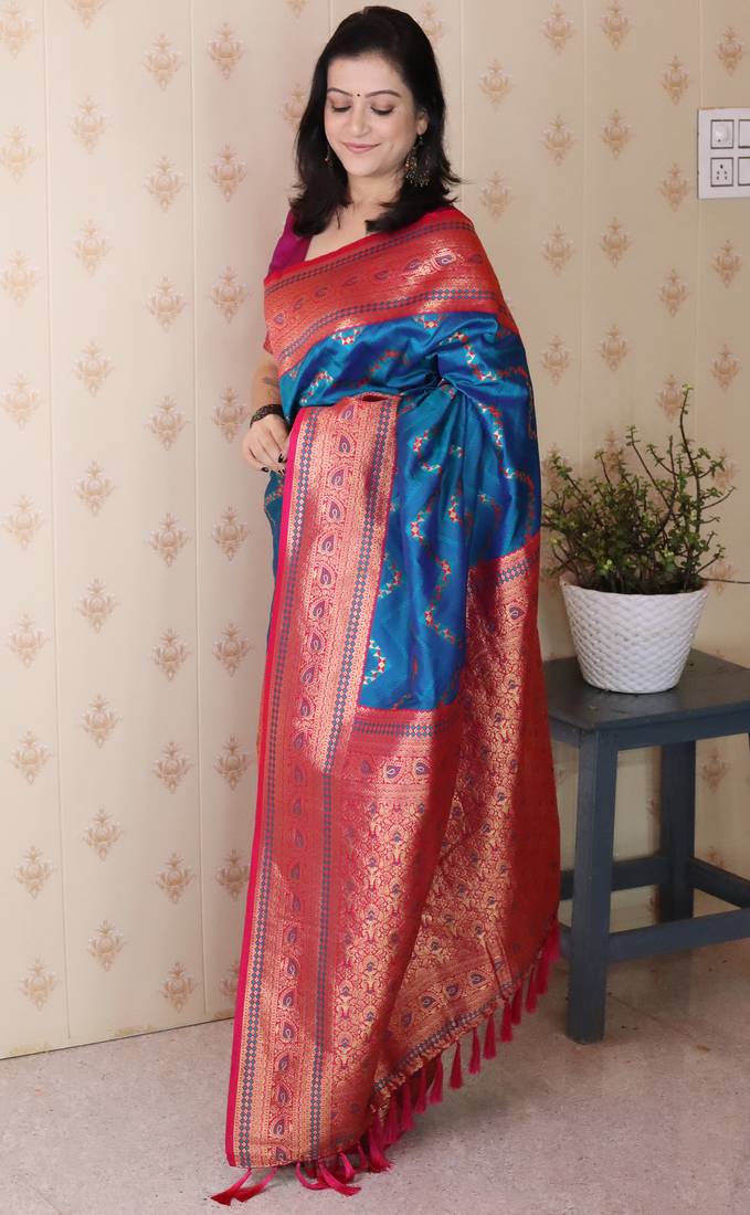 | Product Name | Firozi Color Banarasi Silk Blend Fabric Woven Designer Traditional Saree | |