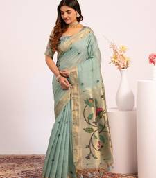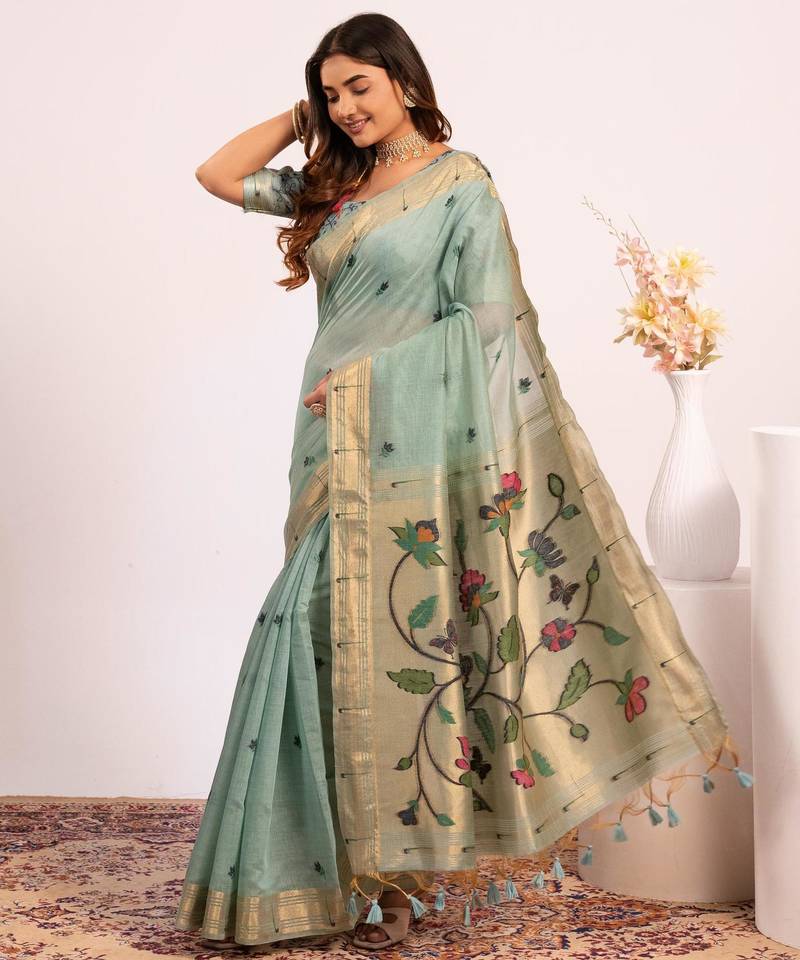 Firozi color muga cotton fabric paithani weaving designer partywear saree