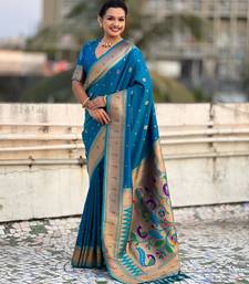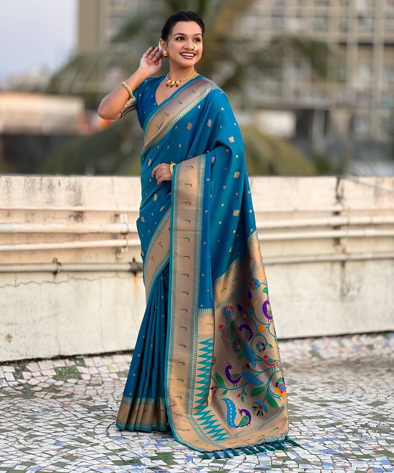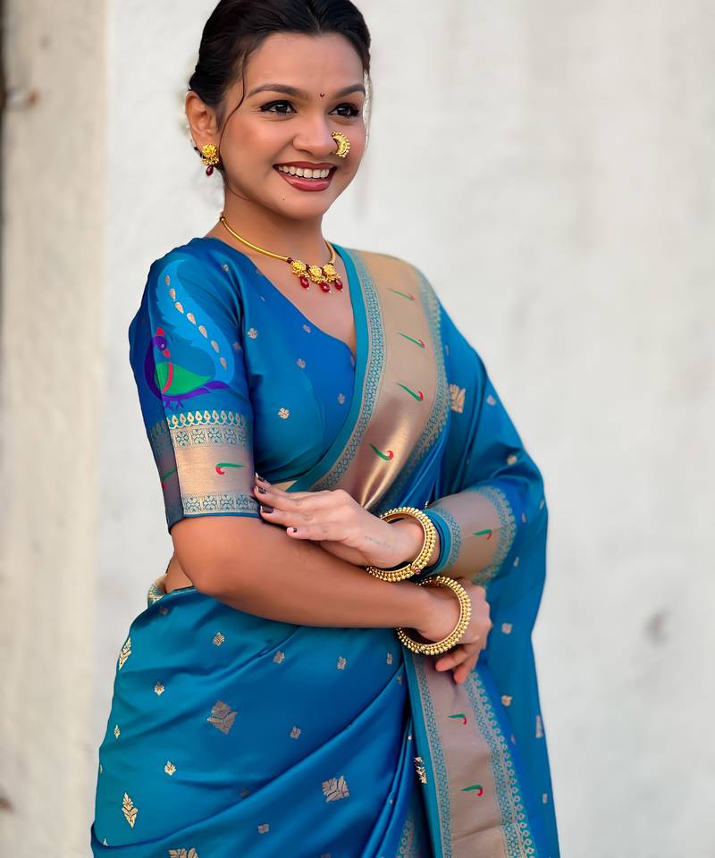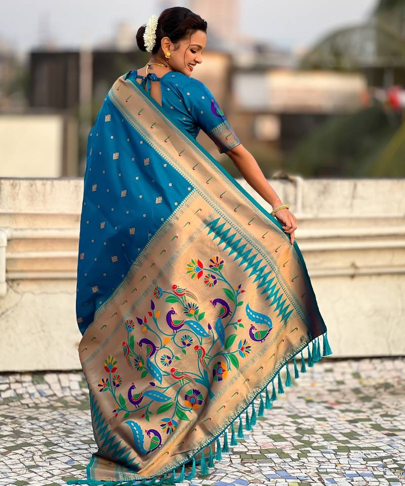Firozi color paithani silk fabric beautiful traditional rich saree
