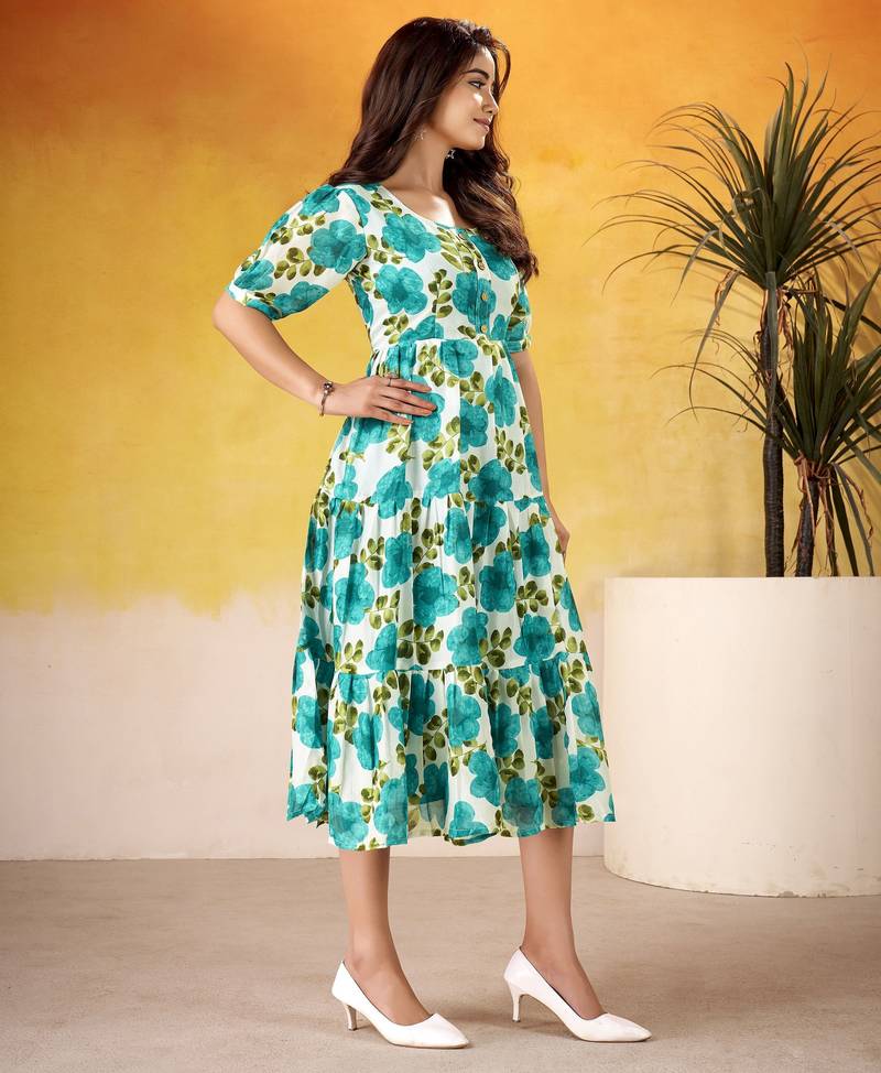 | Product Name | Firozi Color Vichitra Silk Fabric Designer Floral Printed Girlie Partywear Kurti | |