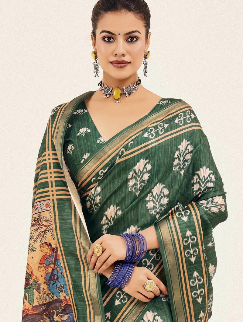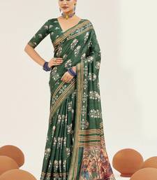 Green color cotton art silk fabric designer digital printed saree