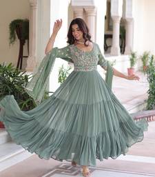 Green color faux georgette fabric glamorous ceremonial gown for wedding looks
