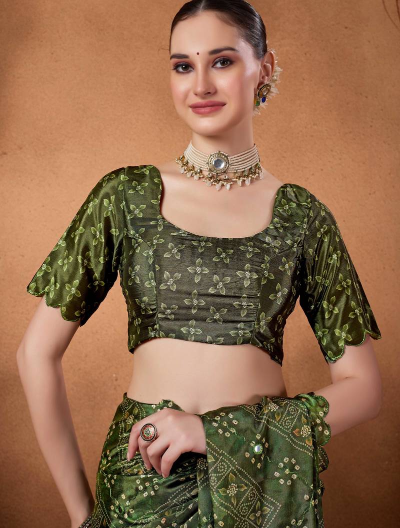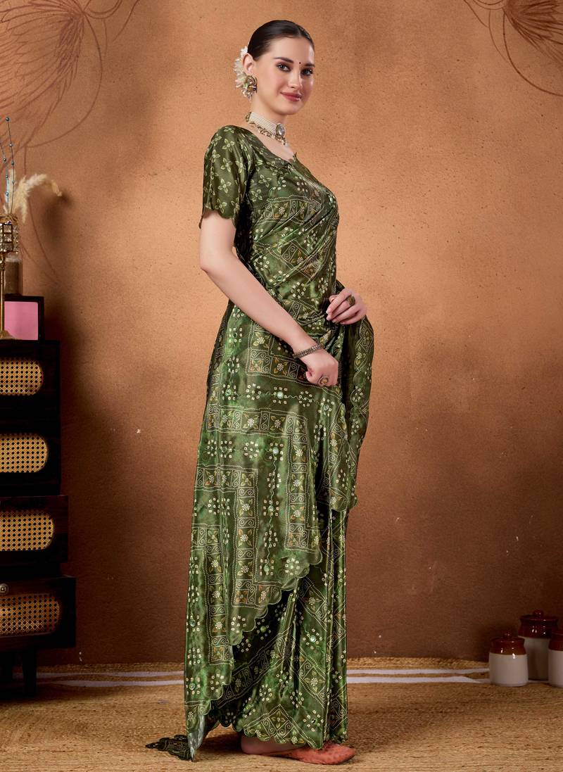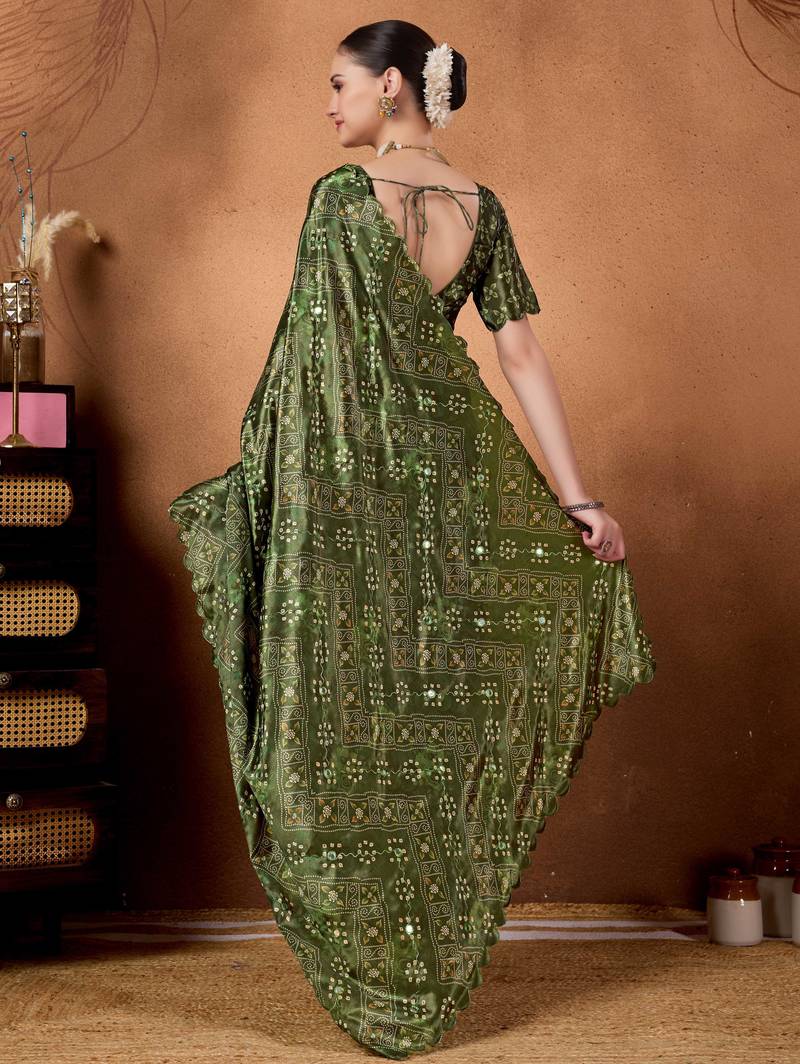 Green color satin silk fabric ready to wear festive rich bandhani saree