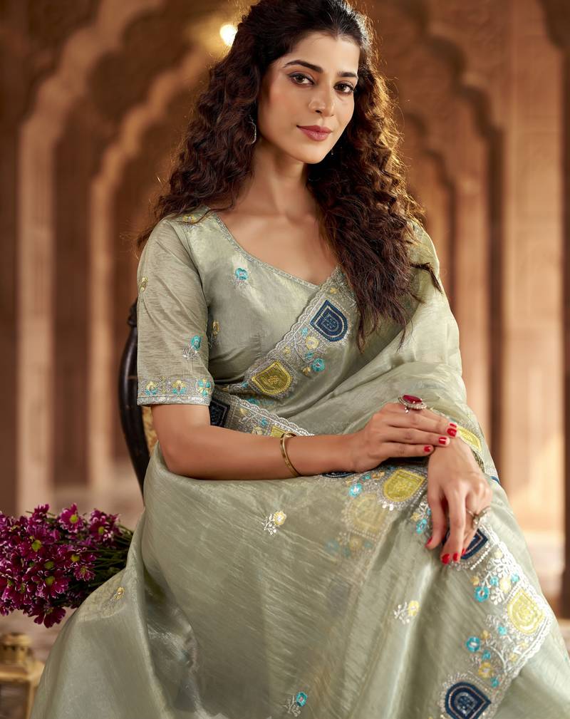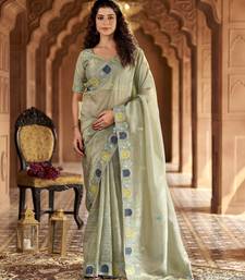 Grey color gold crunchy silk multy thread embroidery work rich fancy saree