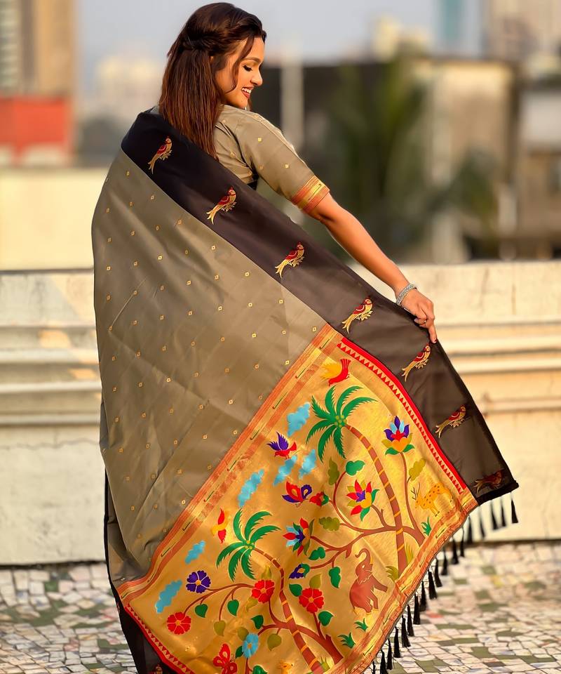Grey color soft silk woven deisgner partywear saree
