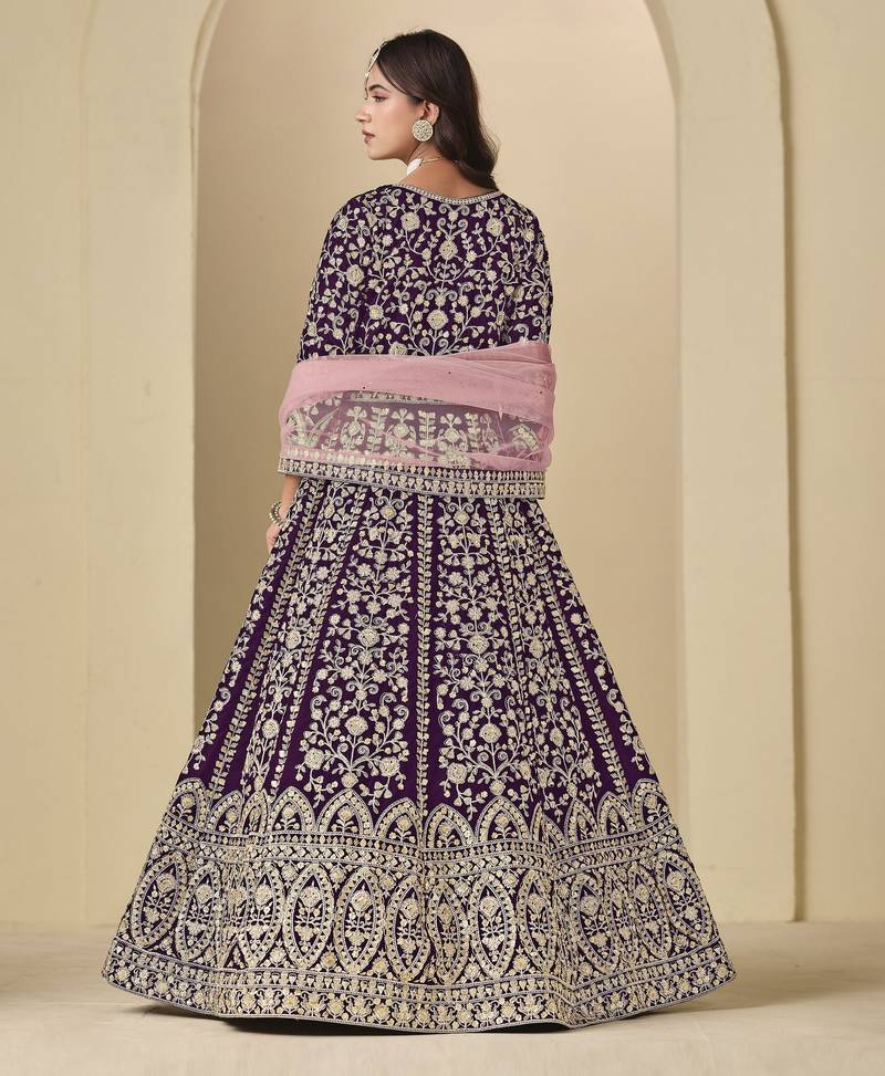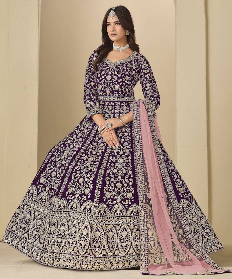 Wine heavy embroidered anarkali suit for ceremonial wear semi stitched