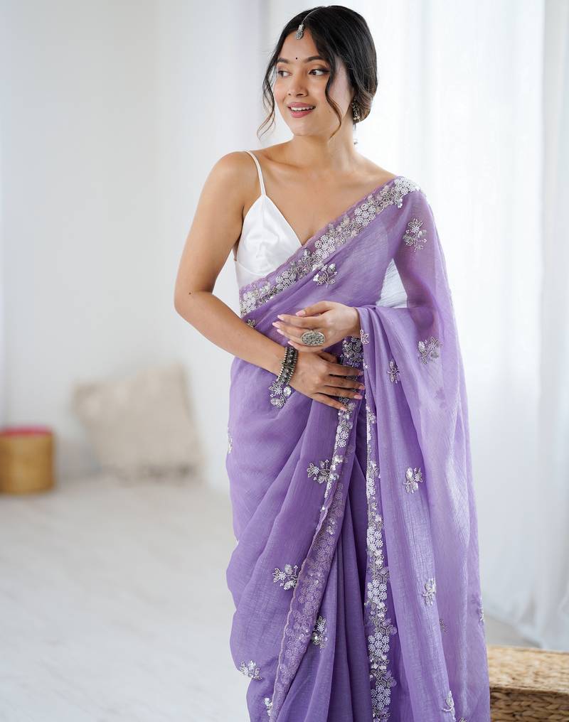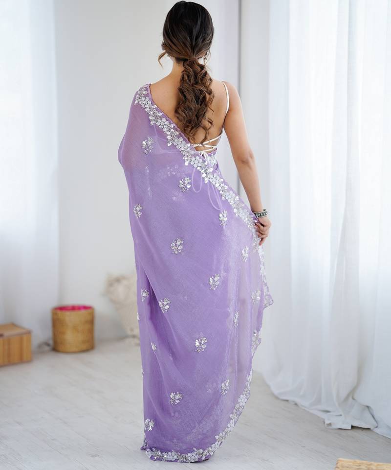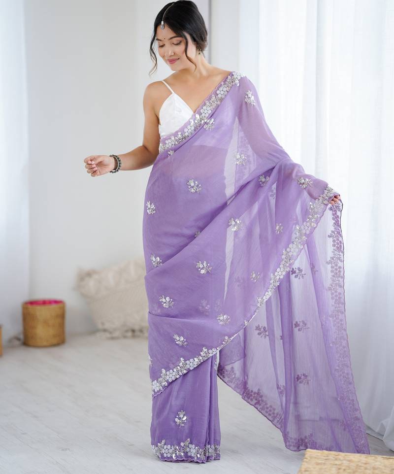 Lavender color chiffon crush fabric heavy designer work partywear saree