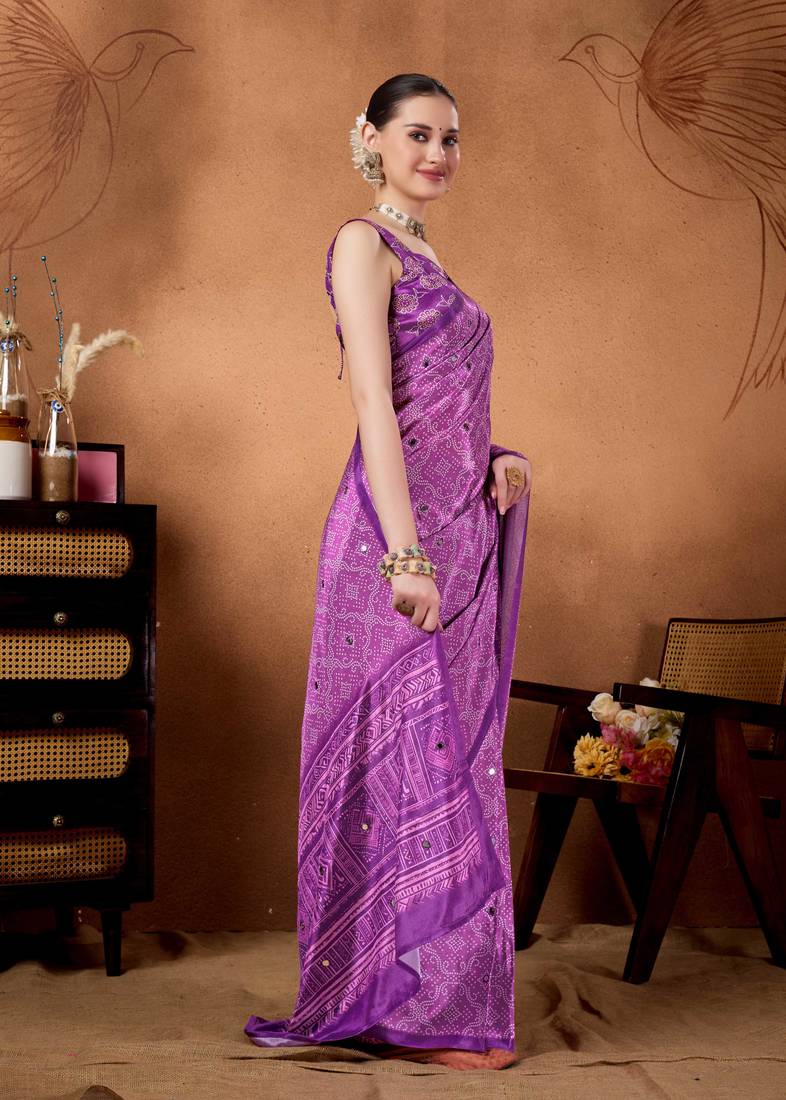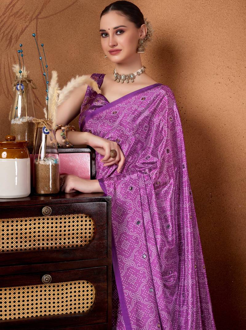 Lavender color satin silk fabric ready to wear festive rich bandhani saree