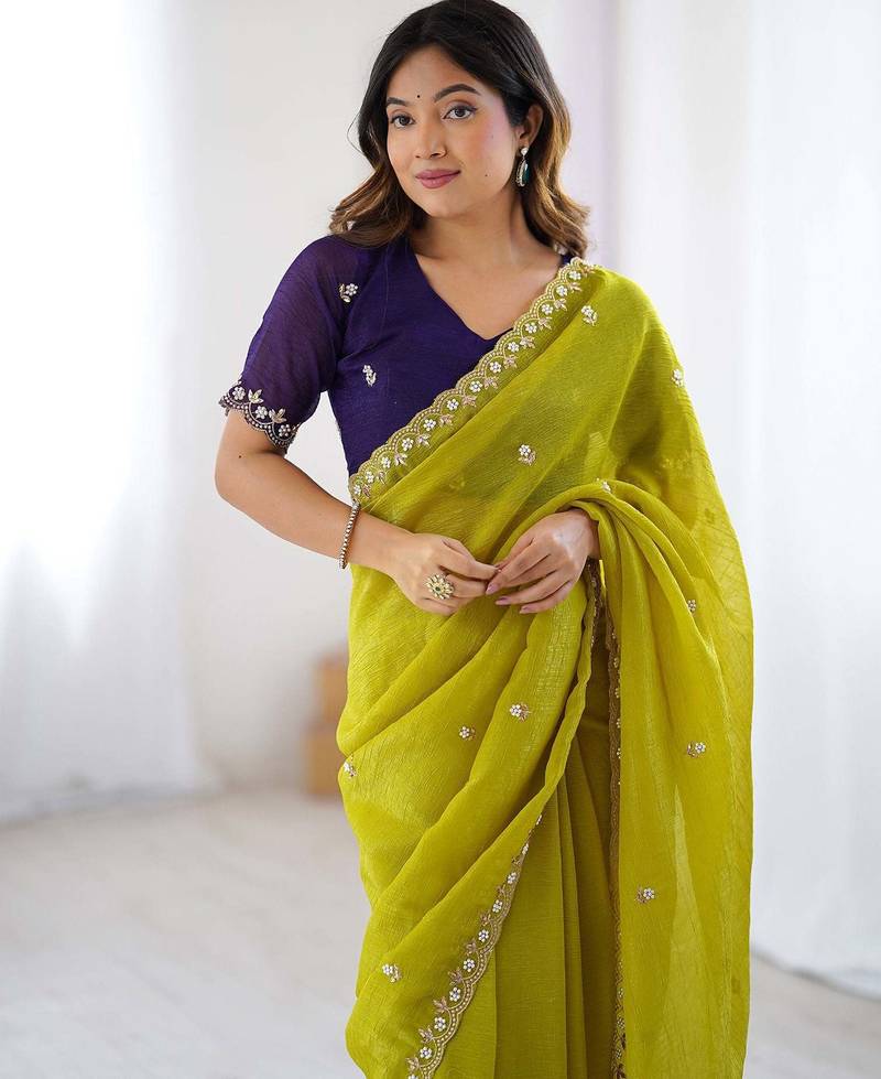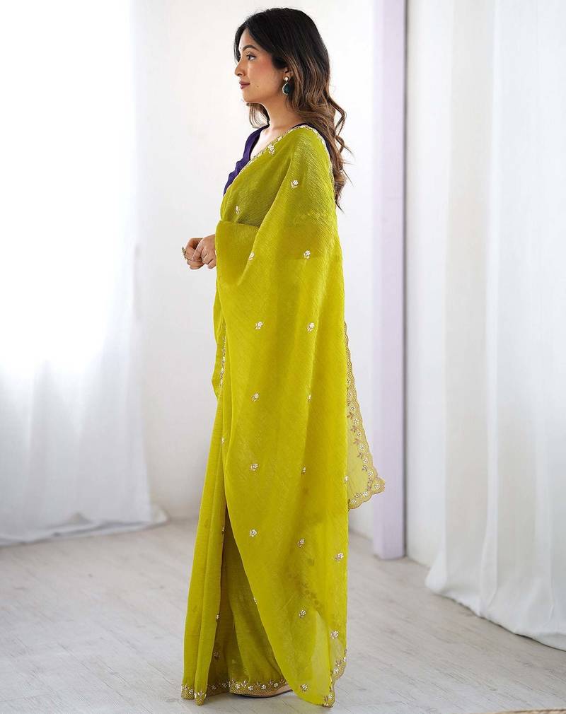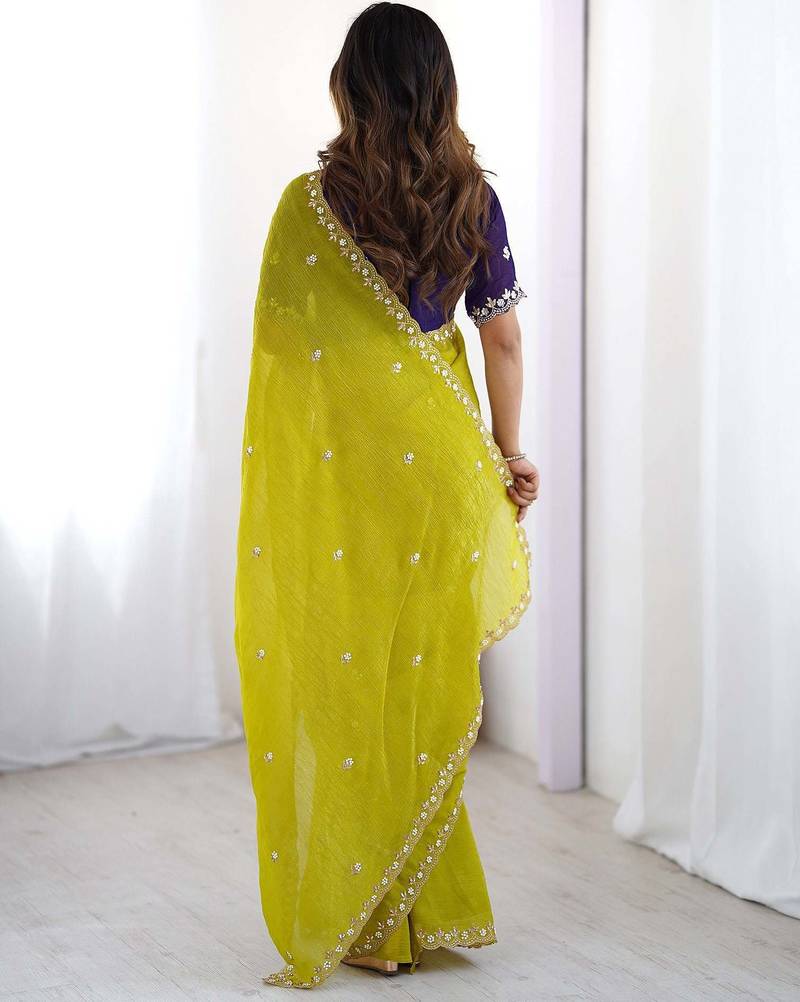 Lemon color chinon fabric embroidery and pearl work work designer saree