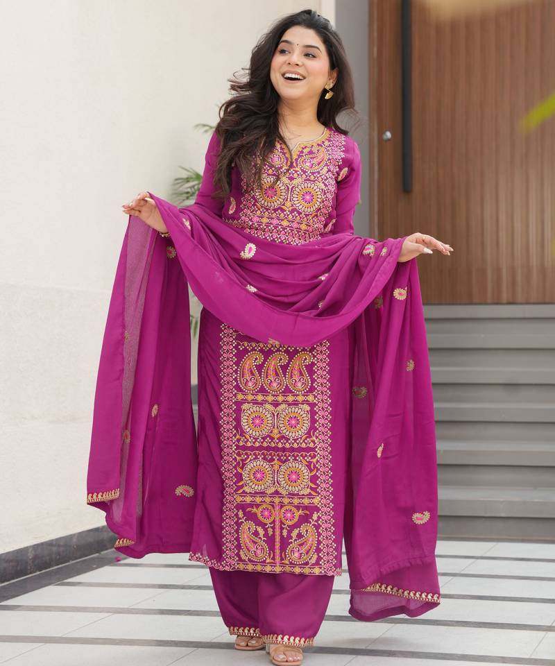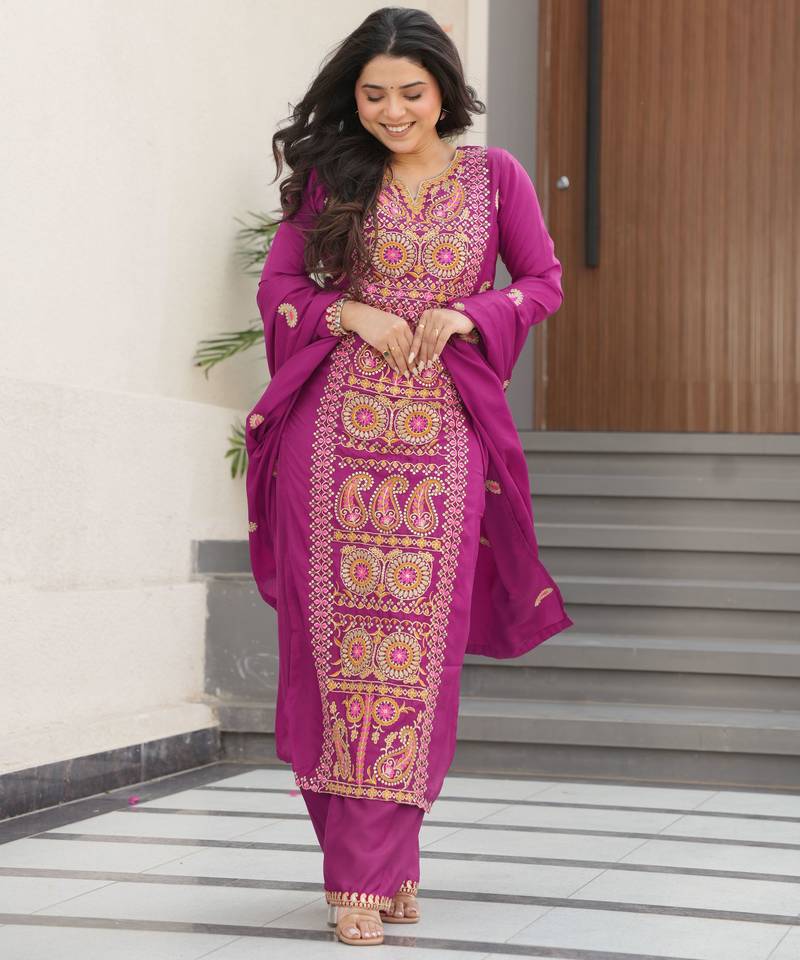 Magenta chinon embroidery work suit