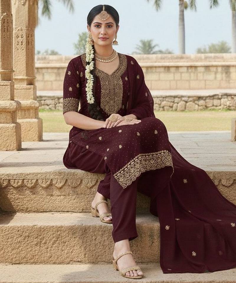 | Product Description | This Maroon Salwar Kameez Is Designed Using Georgette Fabric, Offering A Graceful Fall With A Lightweight And Airy Feel. The Elegant Embroidery Adds Richness And Traditional Charm, Making The Outfit Suitable For Festive Gatherings And Special Celebrations. The Deep Maroon Shade Enhances Its Ethnic Appeal, Creating A Classic And Refined Look. Designed For Comfort And Long Hour Wear, This Embroidered Salwar Kameez Is A Stylish Option For Those Who Prefer Timeless Colors With Subtle Festive Detailing. |