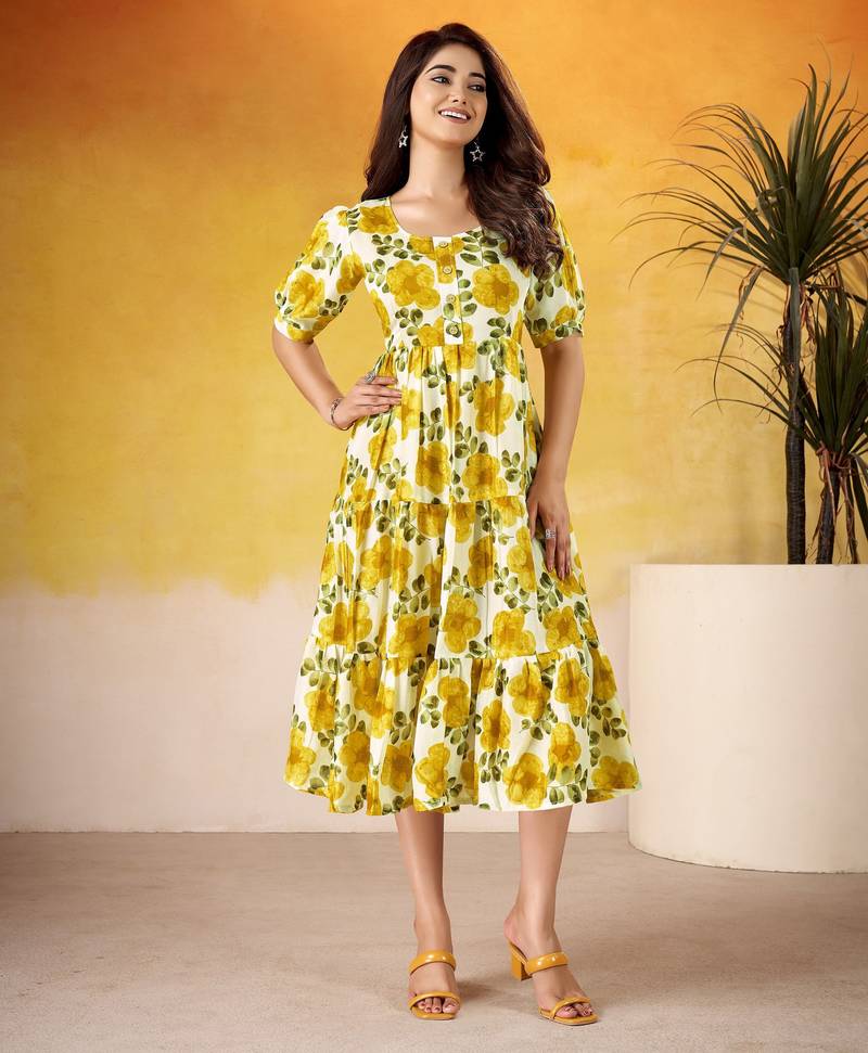 Product Name Mustard Color Vichitra Silk Fabric Designer Floral Printed Girlie Partywear Kurti