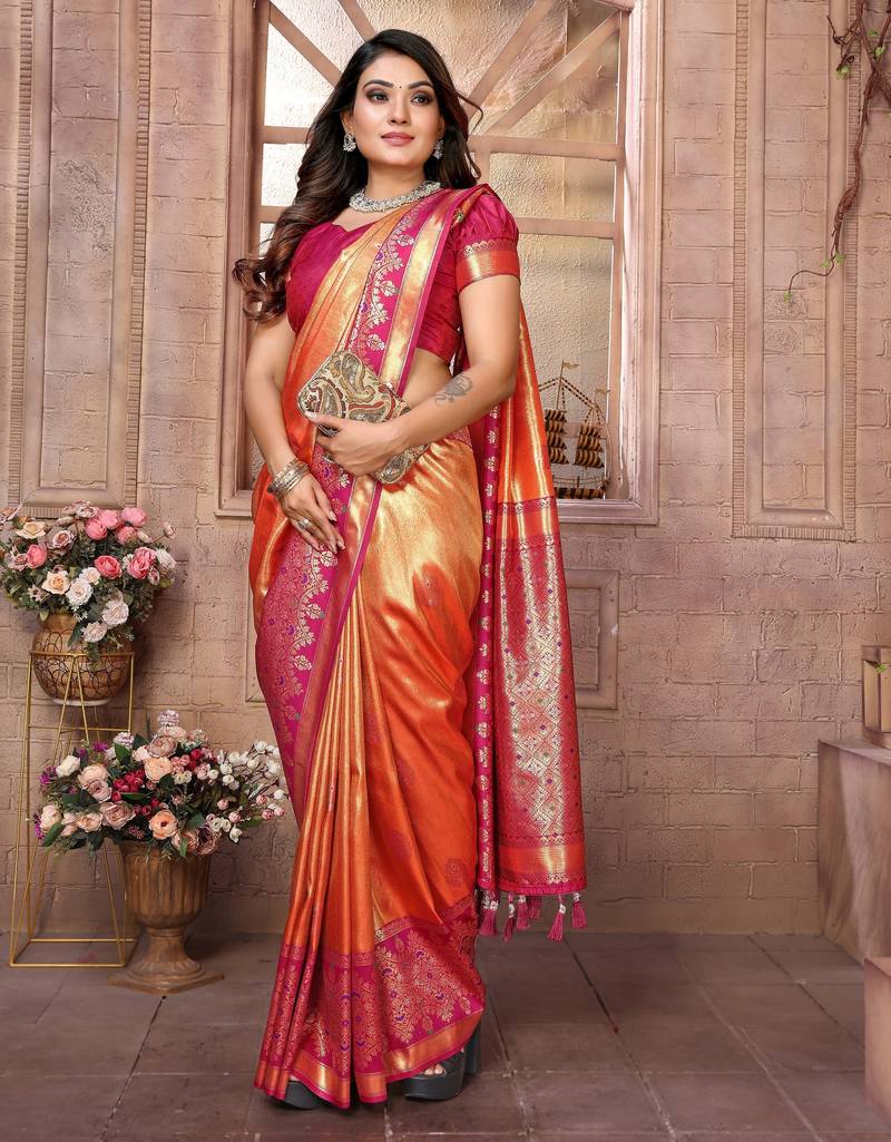 Orange color banarasi tissue silk blend ethnic jacquard weving designer ceremonial saree