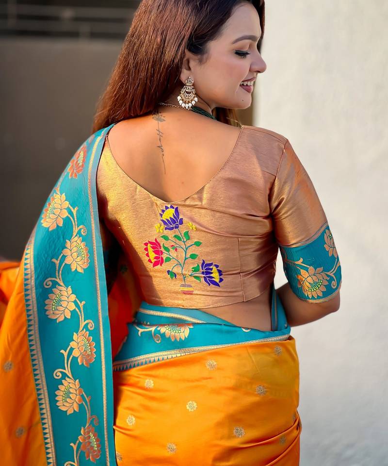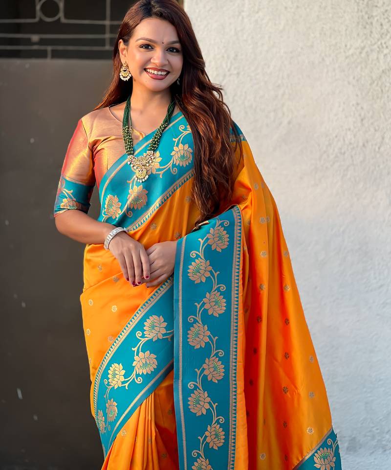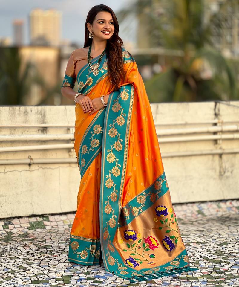 | Product Name | Orange Color Beautiful Woven Lotus Meenakari Designer Graceful Ethnic Saree | |