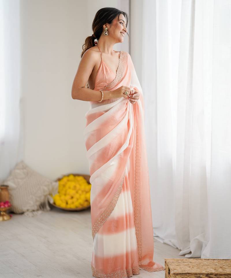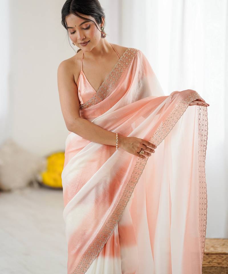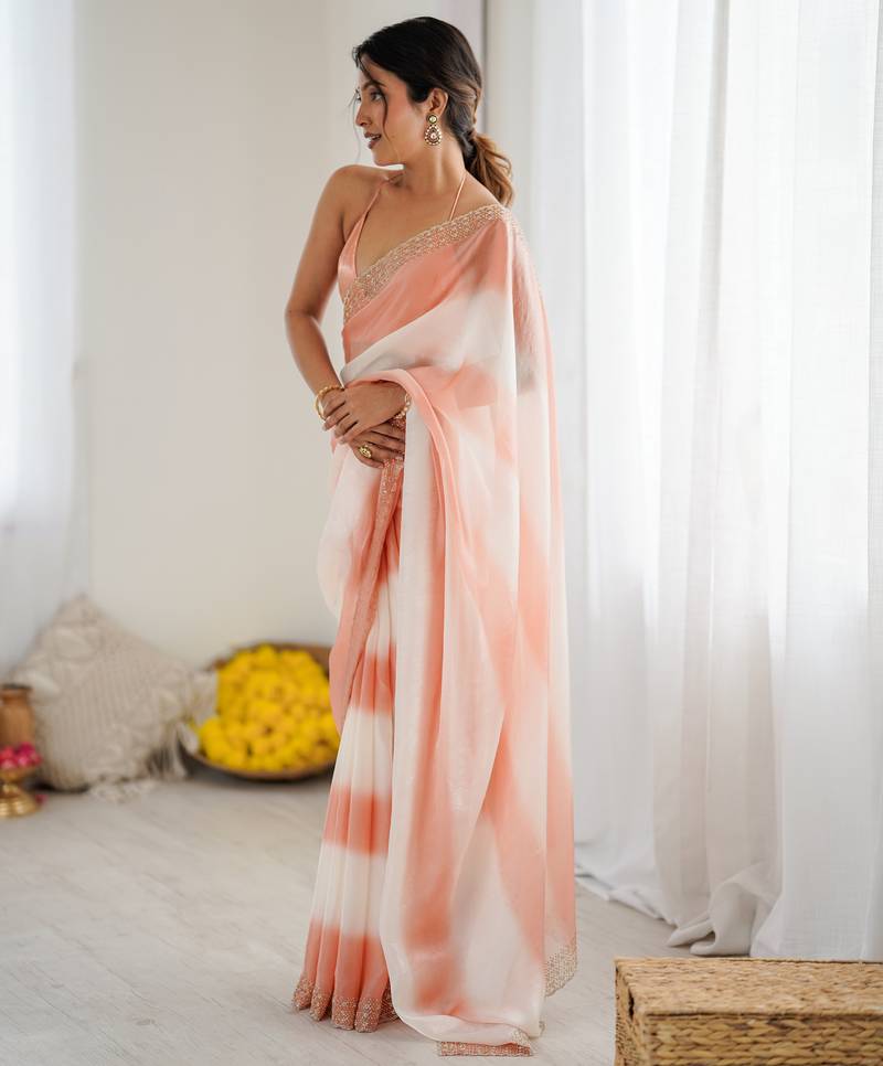 Peach color beautiful fendy satin fabric saree with glamorous zarkan diamond work