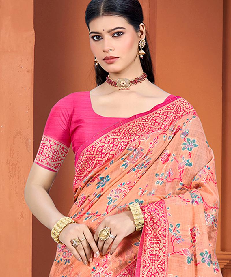 | Product Name | Peach Color Cotton Silk Blend Fabric Woven Meenakari Designer Ethnic Saree | |