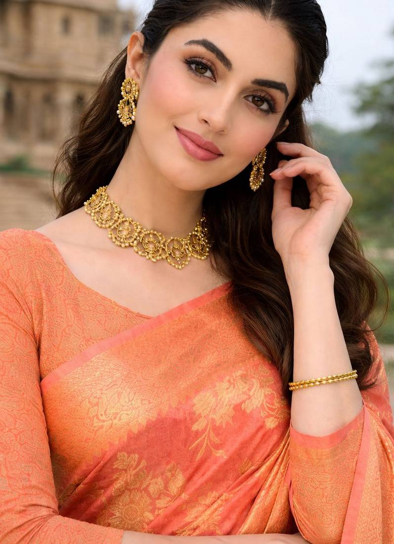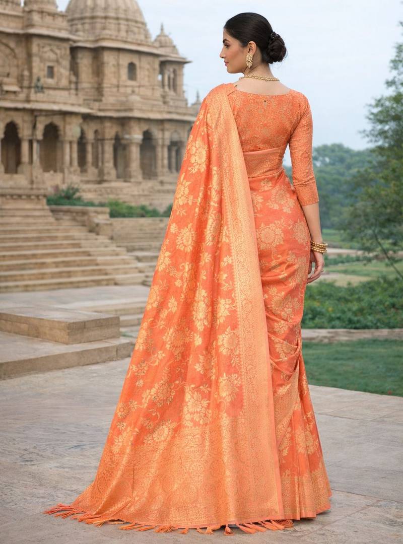 | Product Name | Peach Color Ethnic Crepe Silk Blend Fabric Woven Jacquard Designer Ceremonial Saree | |