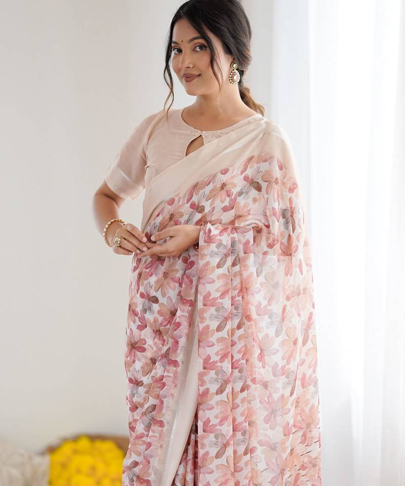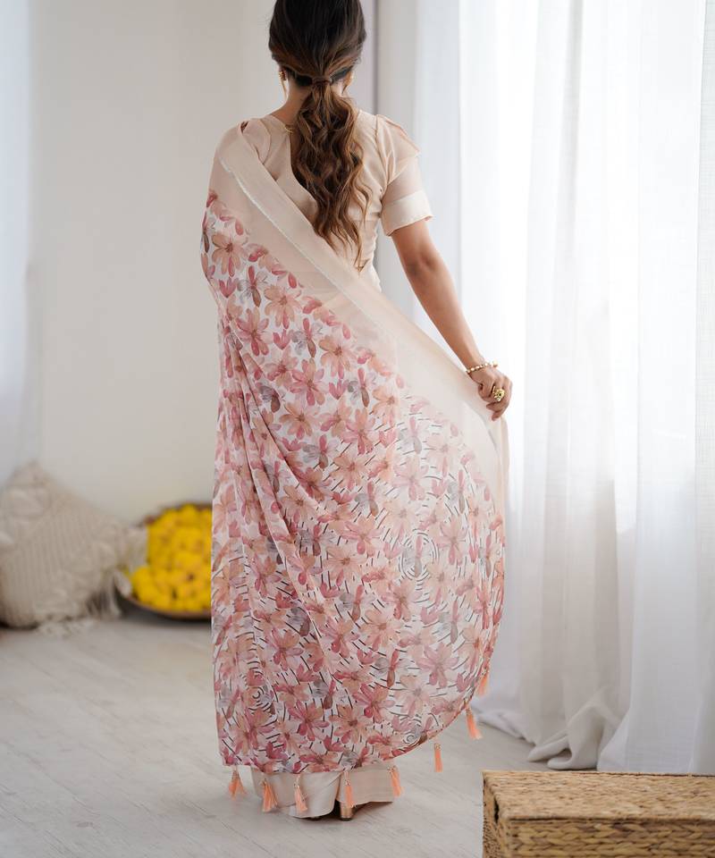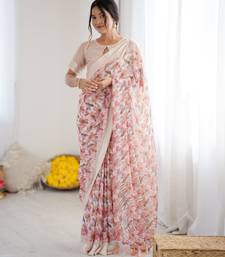 Peach color moss satin patta fabric designer printed ethnic partywear saree