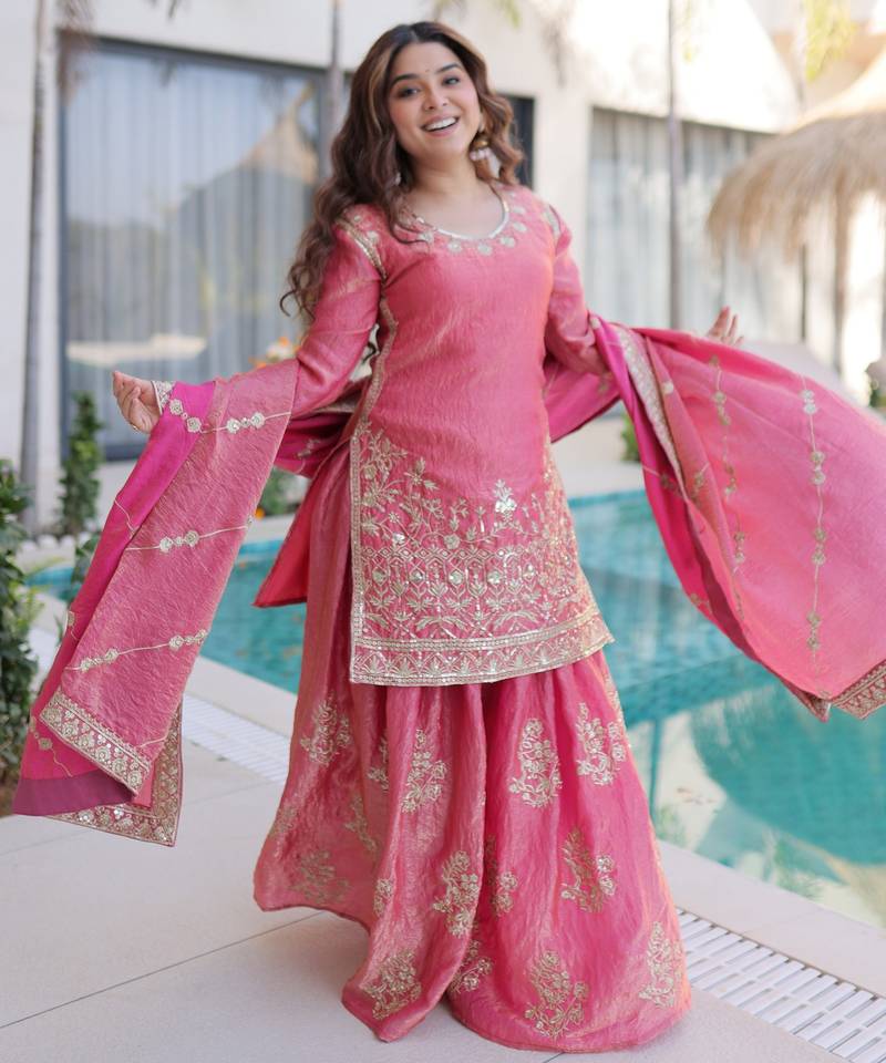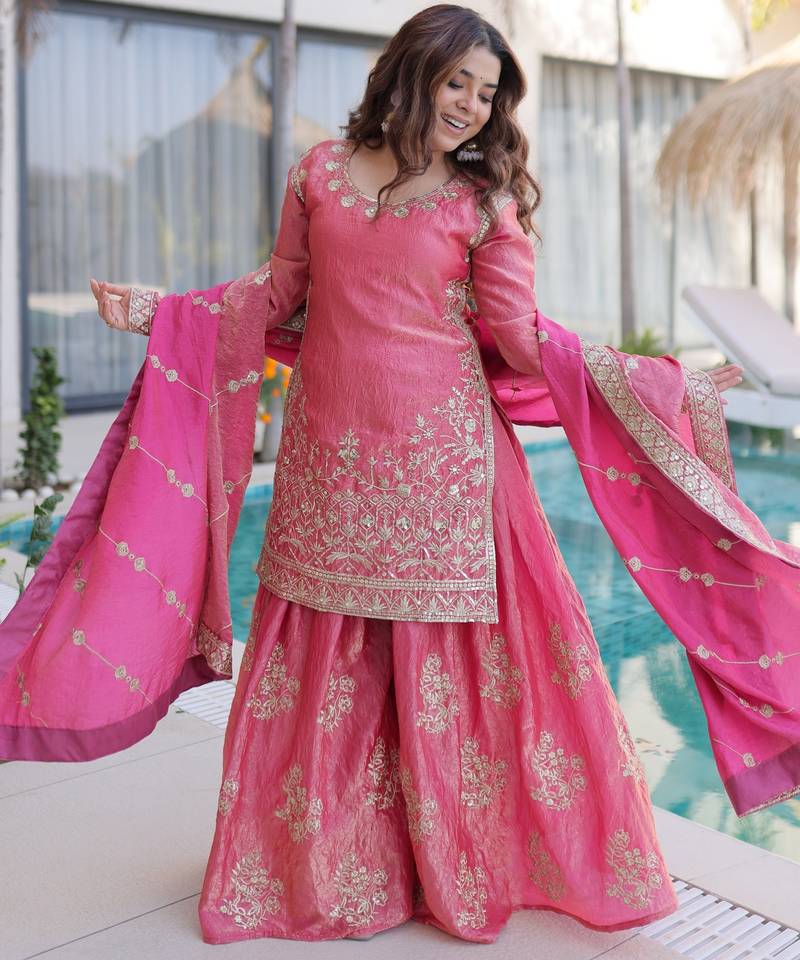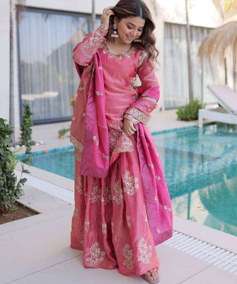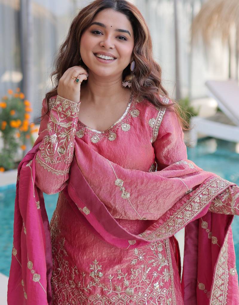 | Product Name | Pink Color Fendy Crush Fabric Classy Sequins Embroidered Partywear Readymade Suit With Dupatta | |