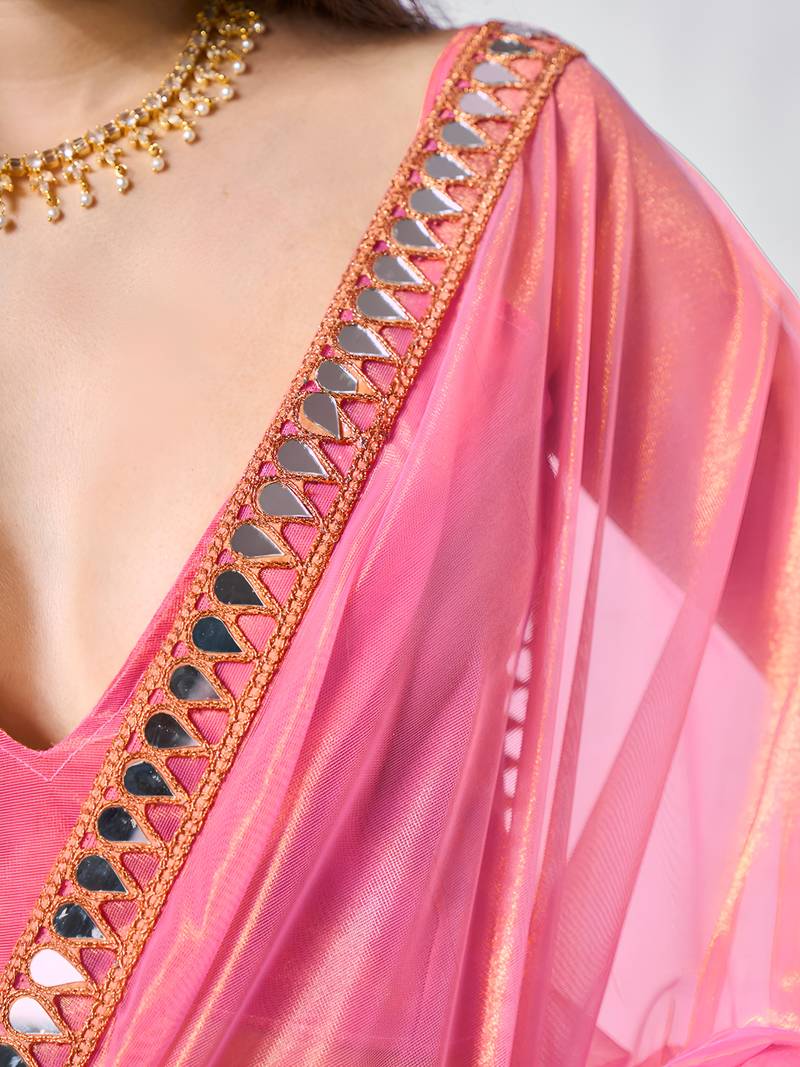 Product Name Pink Color Gold Twill Net Fabric Real Mirror And Coding Lace Work Work Designer Saree