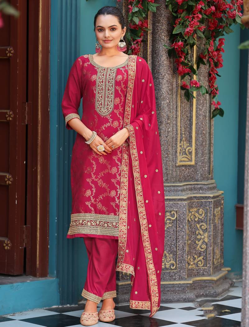 Pink color viscose jacquard designer woven and embroidered salwar kameez semi stitched