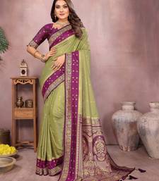 Pista color handloom silk blend fabric weaving designer ethnic partywear saree