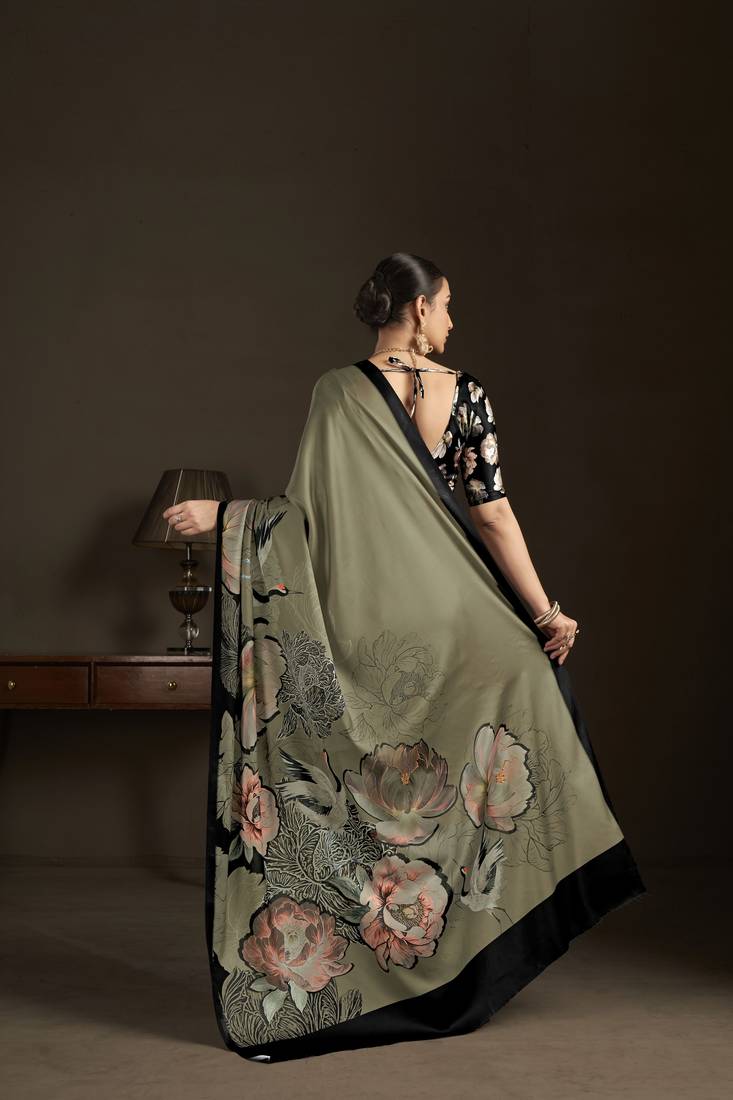 Pista color stylish digital printed silk blend crepe fabric saree for trendy looks