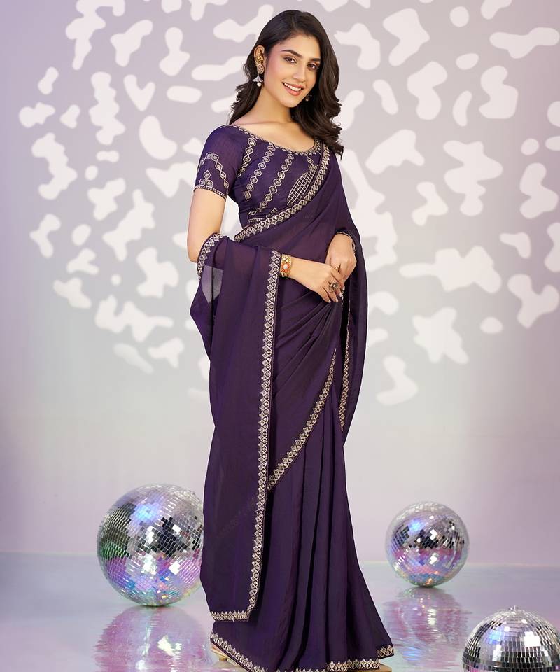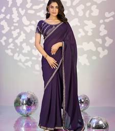 Purple color ethnic embroidered moss chiffon fabric girlie partywear saree