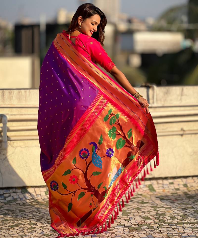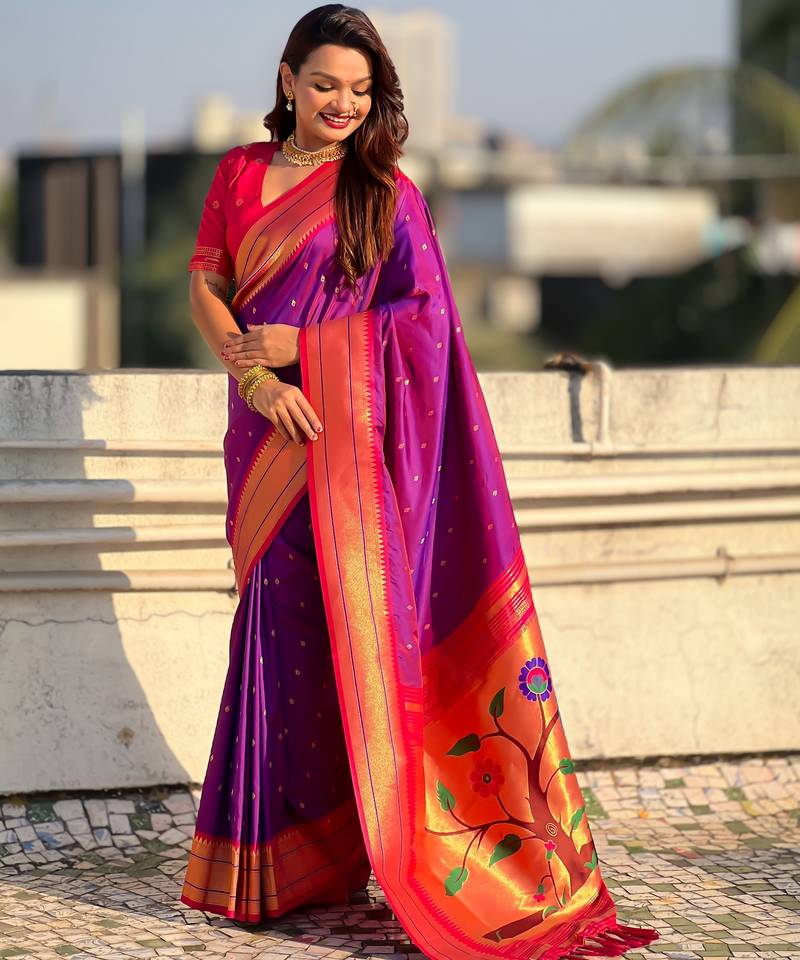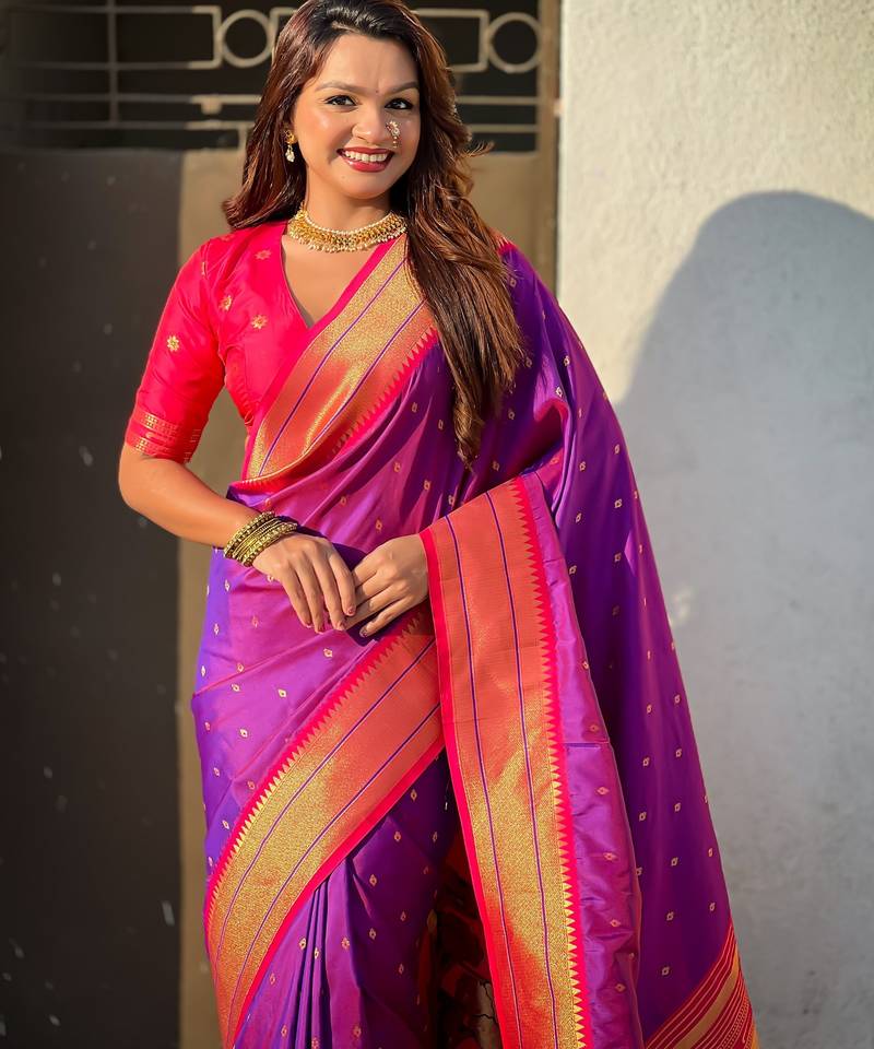 Product Name Purple Color Paithani Silk Fabric Woven Designer Saree