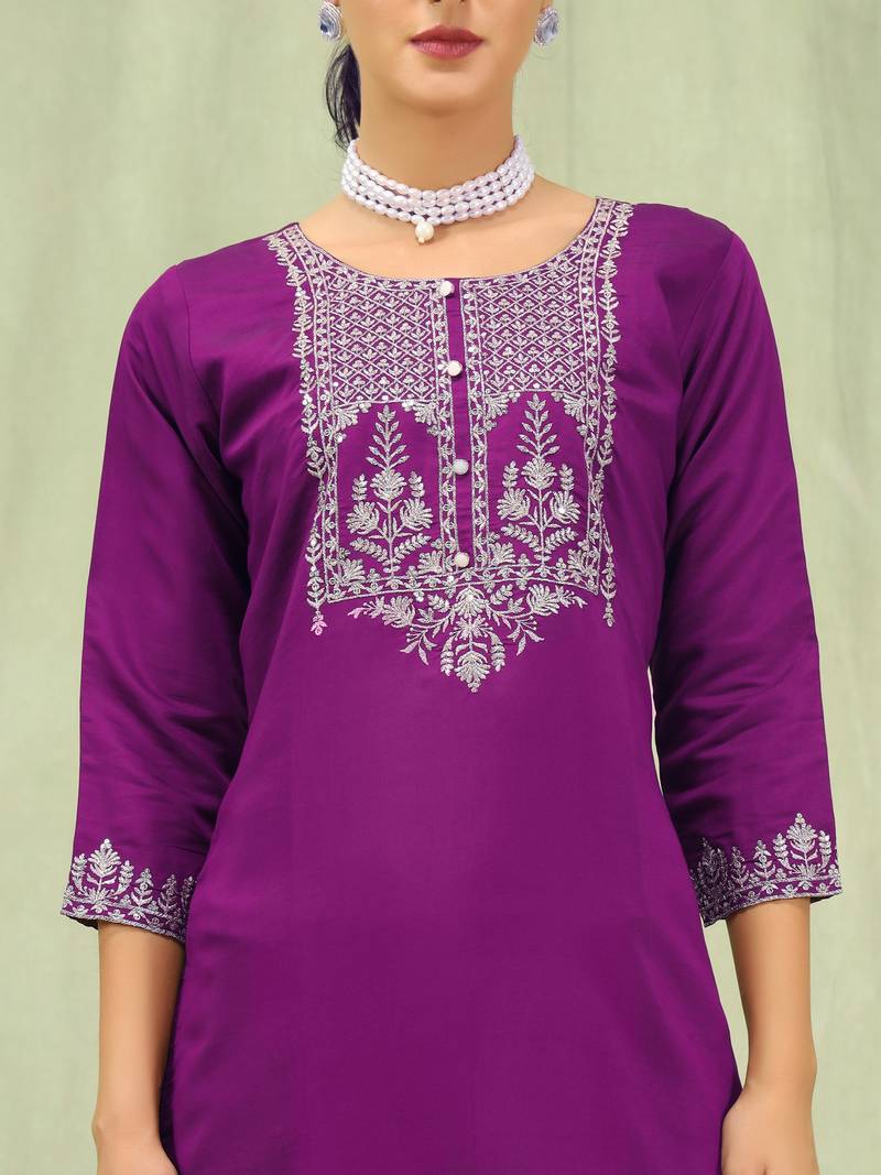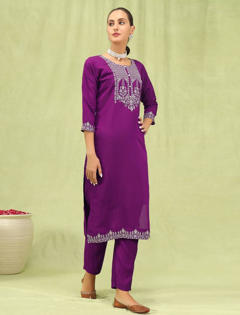 | Product Name | Purple Color Viscose Roman Silk Fabric Designer Embroidered Suit | |
