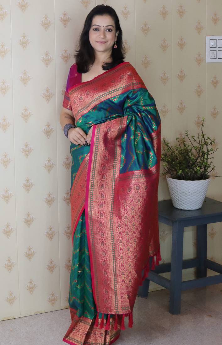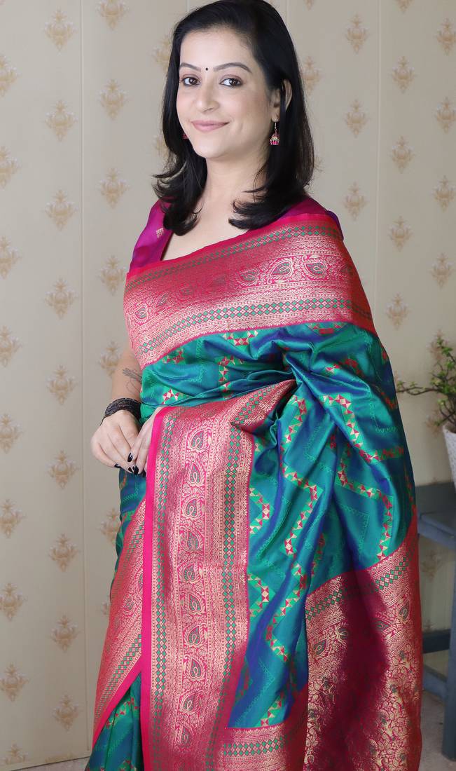 Rama color banarasi silk blend fabric woven designer traditional saree