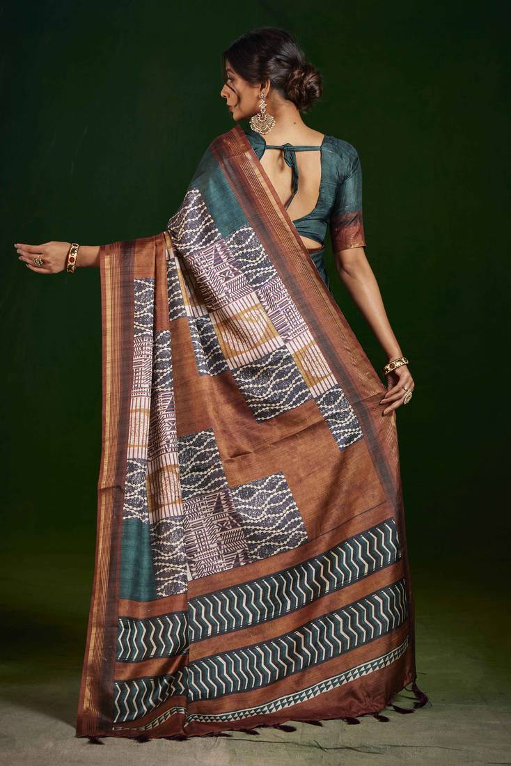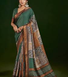 Rama color gathan silk blend fabric designer digital printed partywear saree