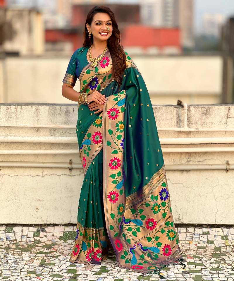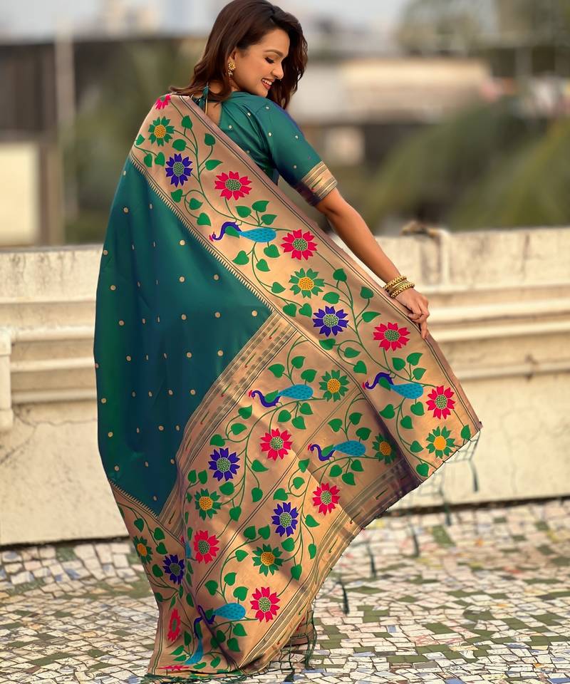 | Product Name | Rama Color Paithani Silk Blend Fabric Woven Designer Partywear Saree | |