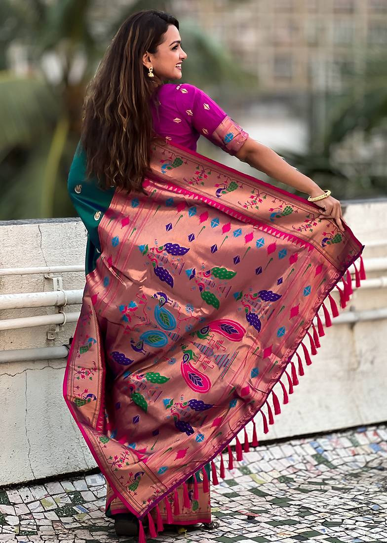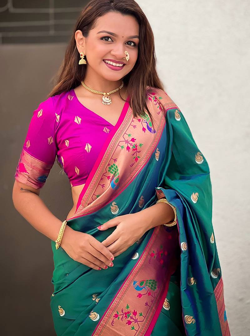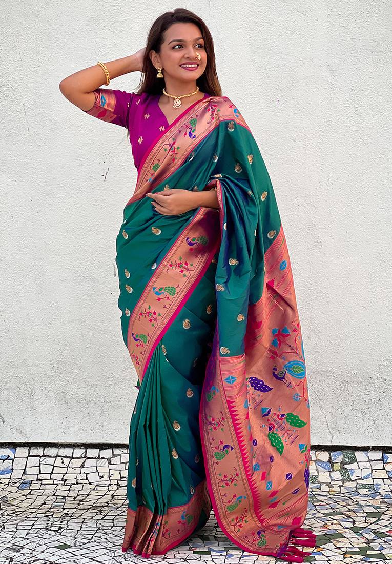 | Product Description | Looking These Party Wear Saree In Fine Colored.These Saree And Blouse Is Fabricated On Soft Silk.Its Beautified With Weaving Meenakari Paithani Designer. |