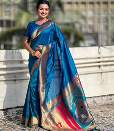 Rama color soft silk blend fabric woven paithani designer cultural rich saree