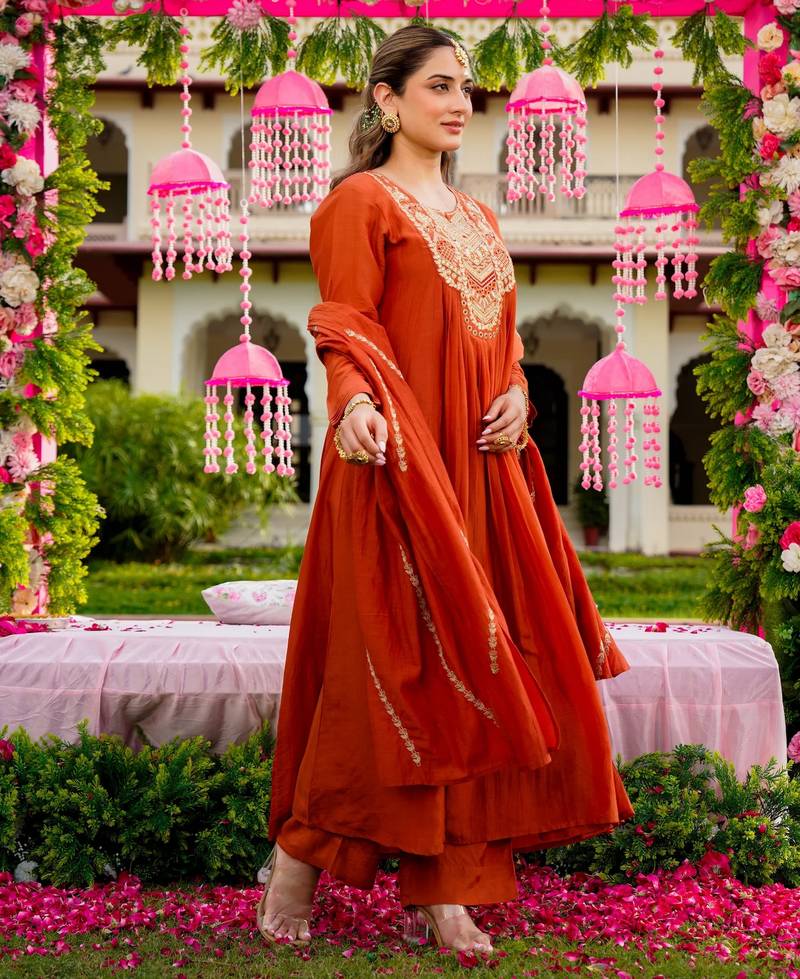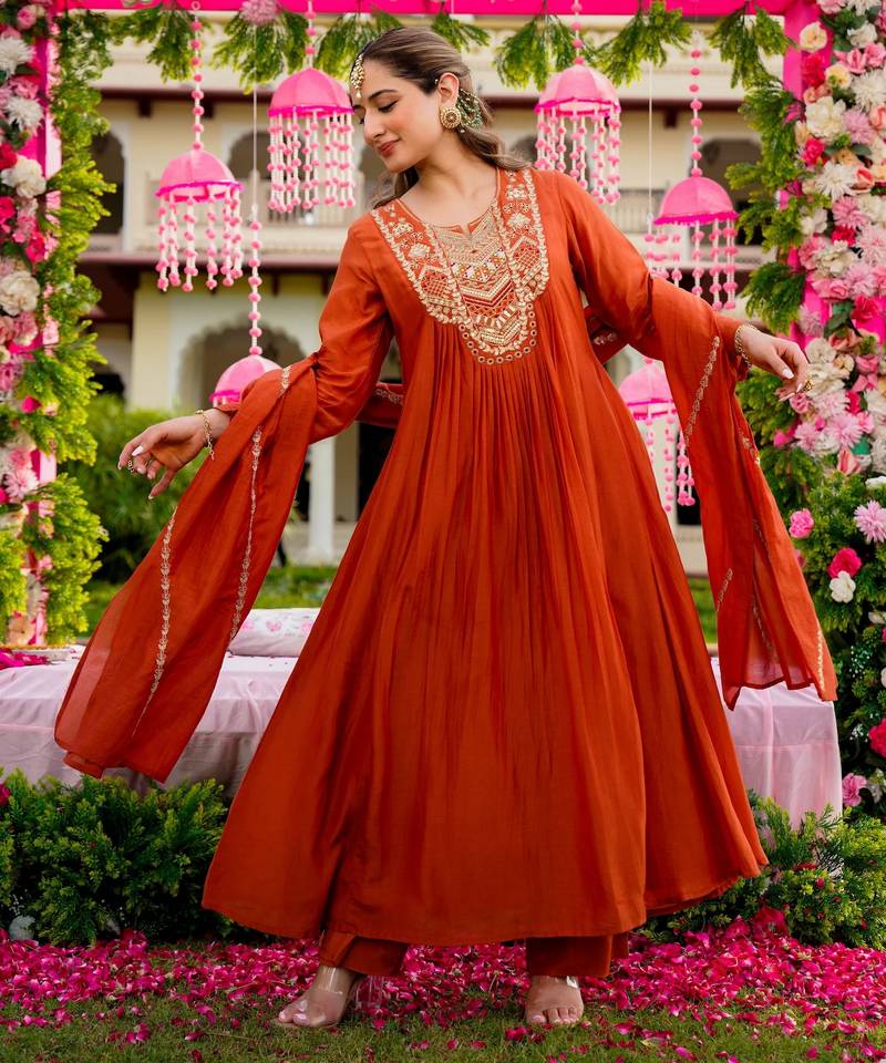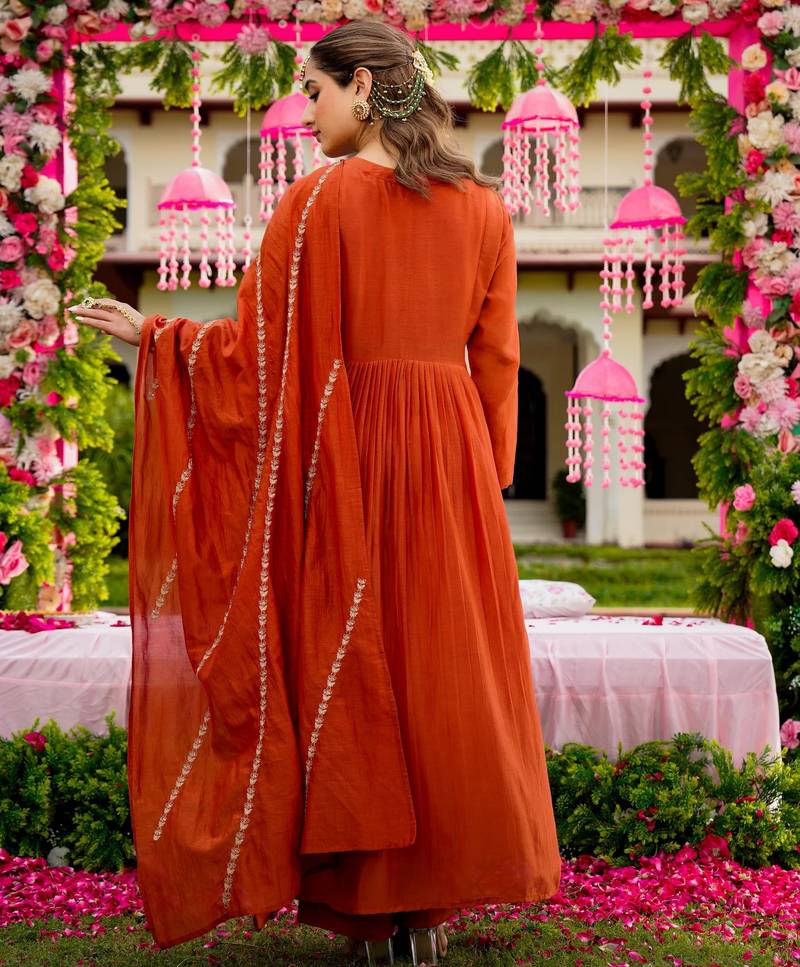 | Product Name | Rust Color Beautiful Readymade Dress On Vichitra Silk Fabric For Graceful Girlie Looks | |