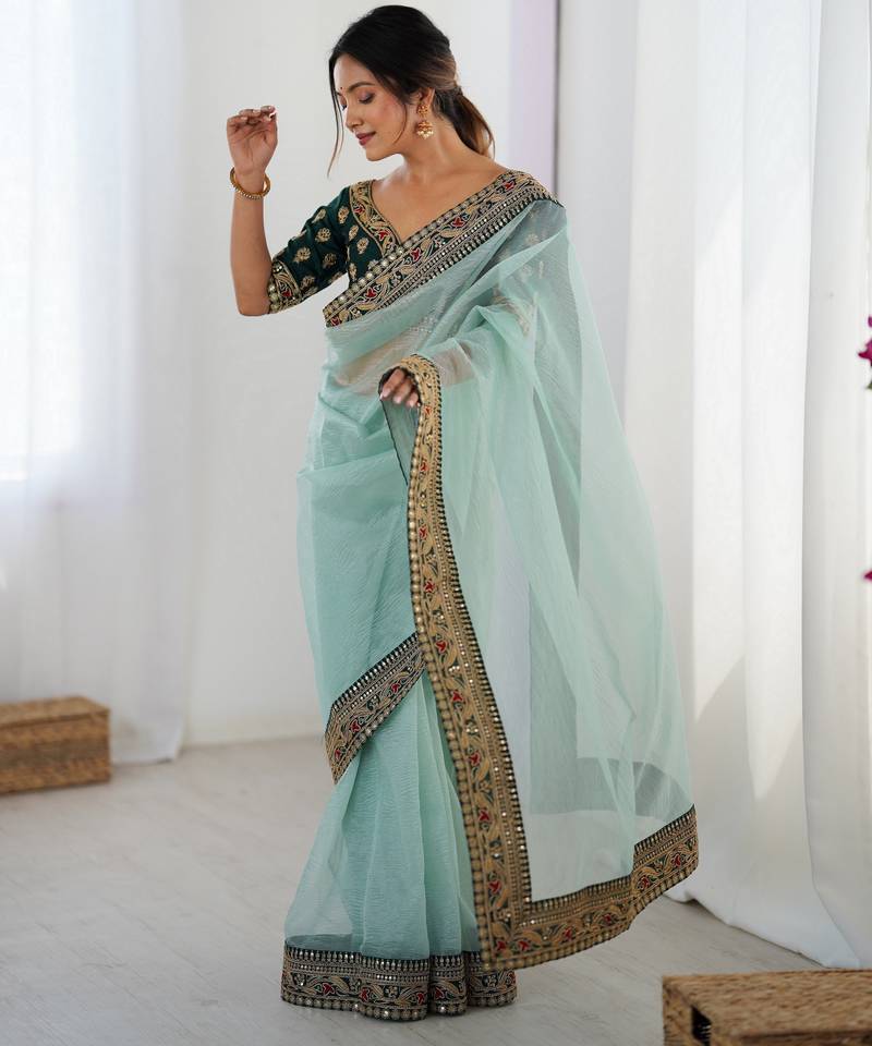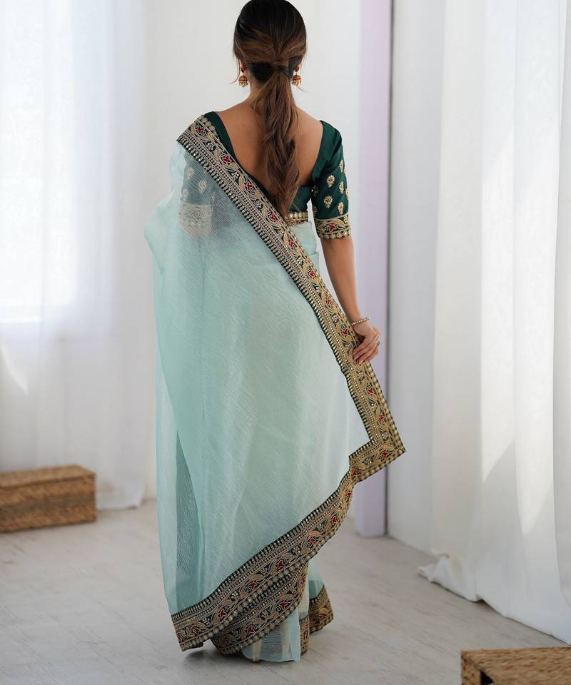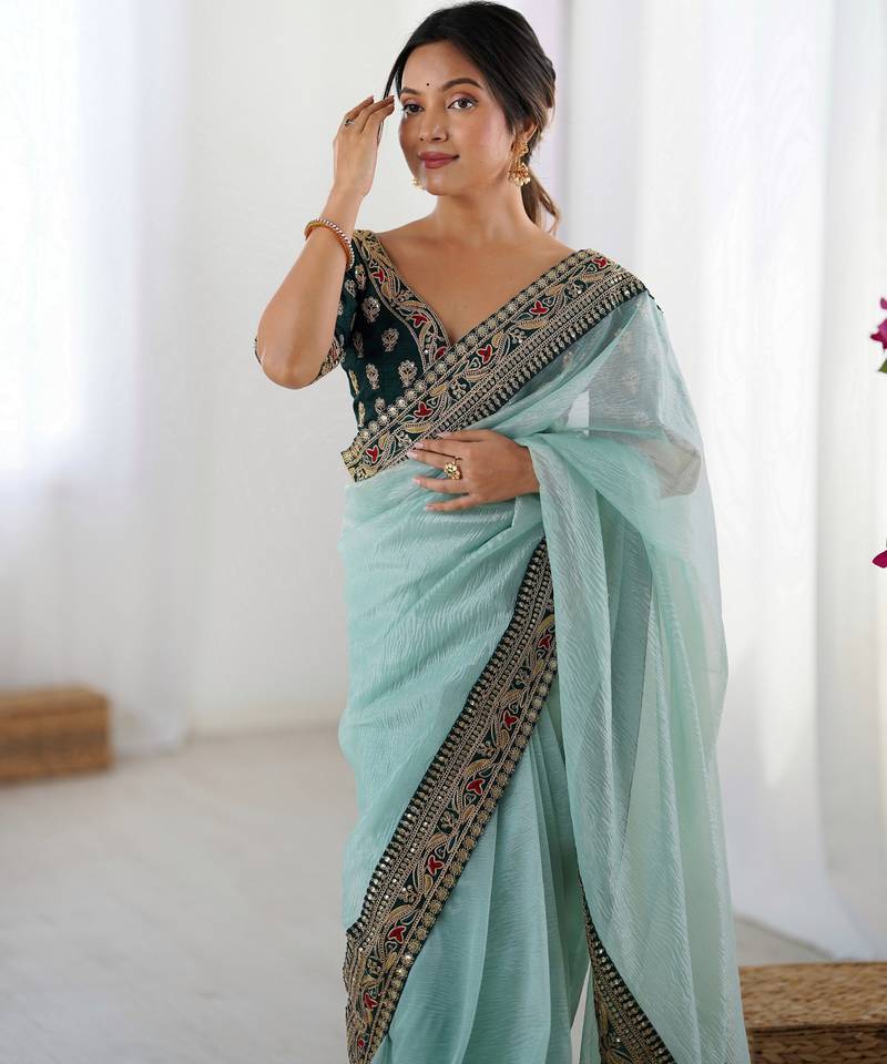 Sea green color banarasi crush fabric graceful partywear sequins embroidered saree