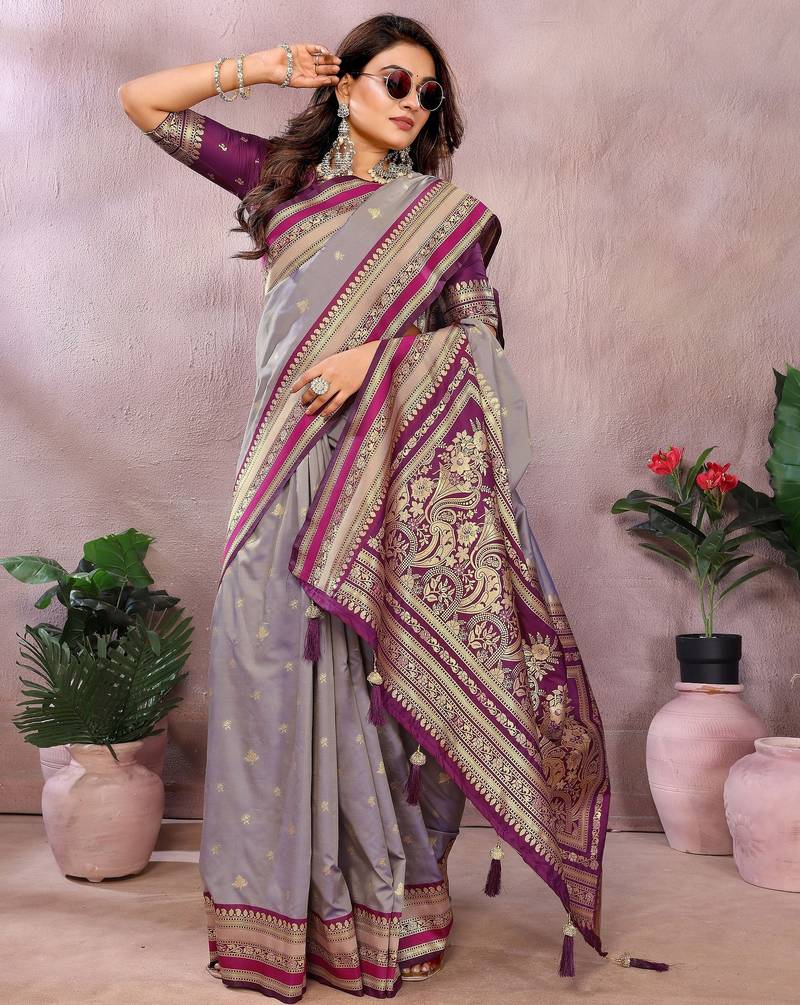 Silver grey color handloom silk fabric jacquard weaving designer partywear saree