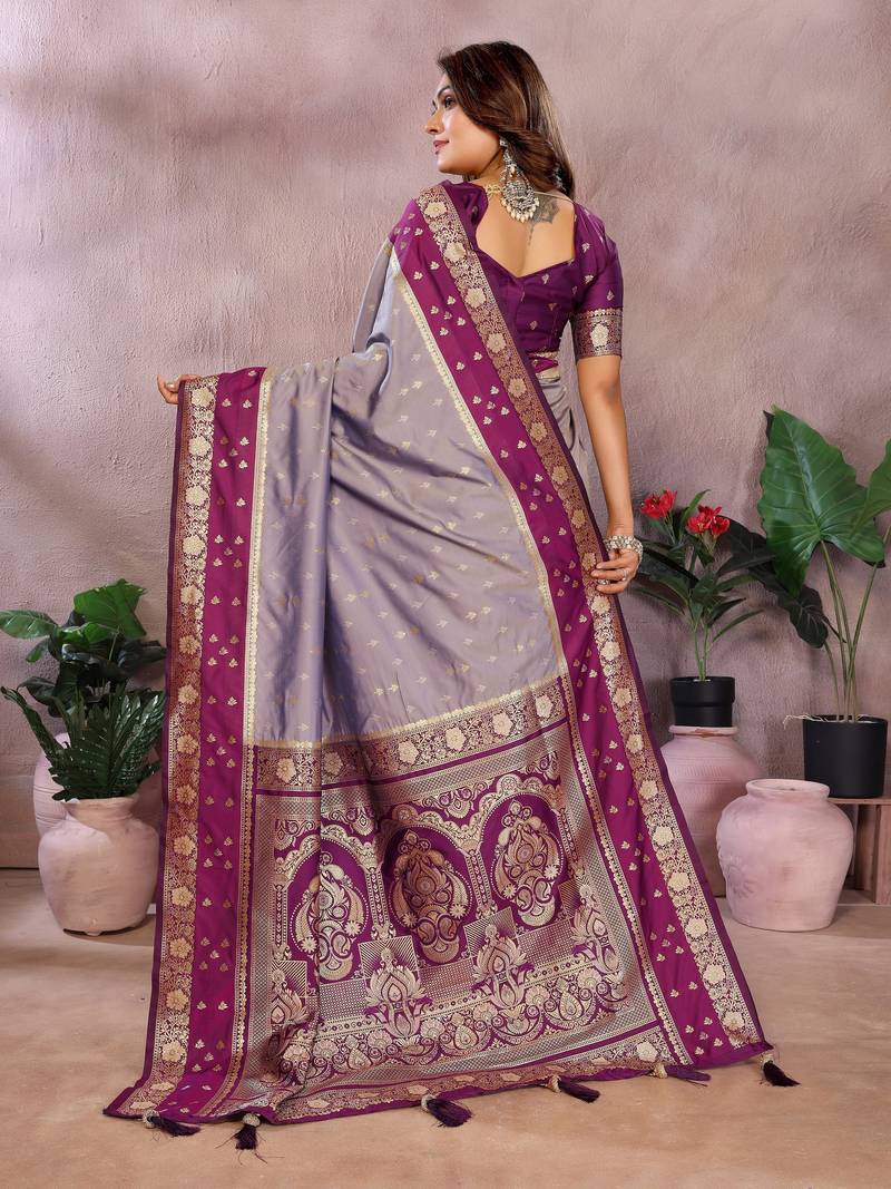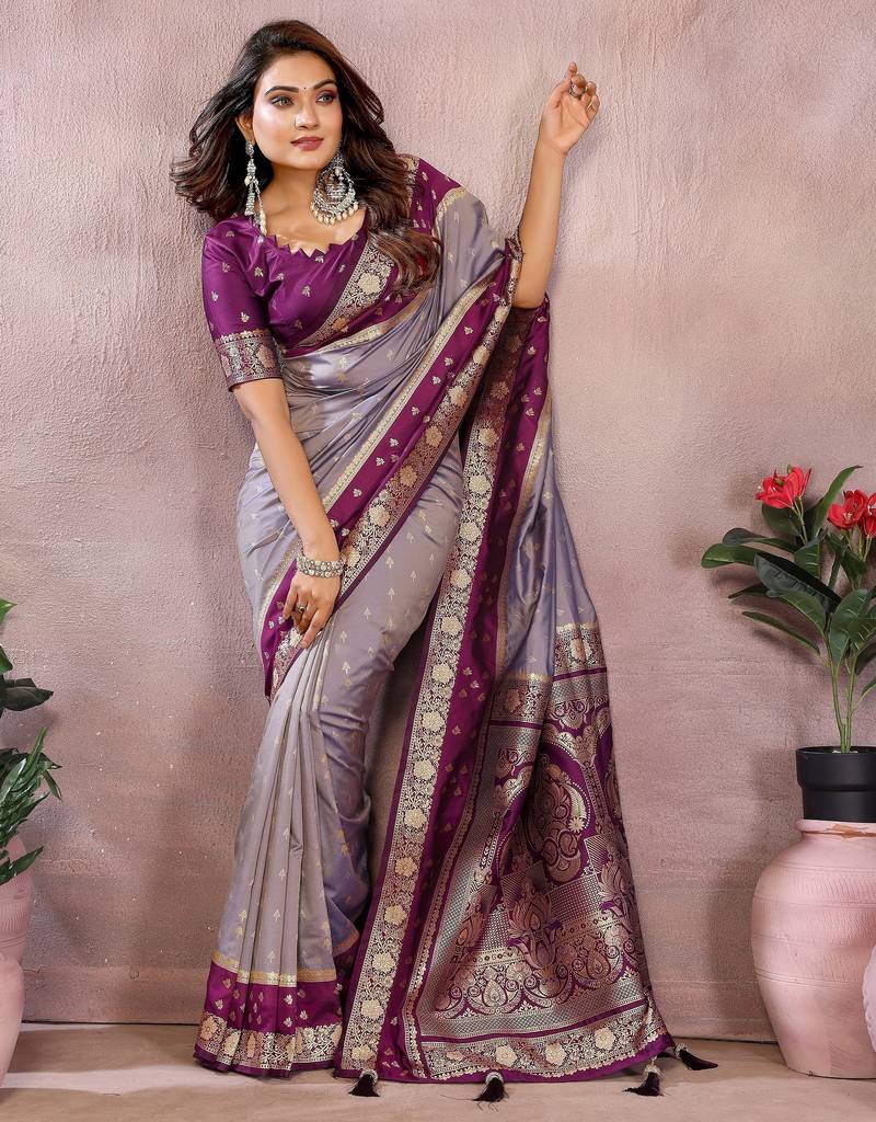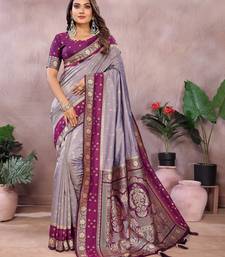Silver grey color handloom silk blend fabric weaving designer ethnic partywear saree
