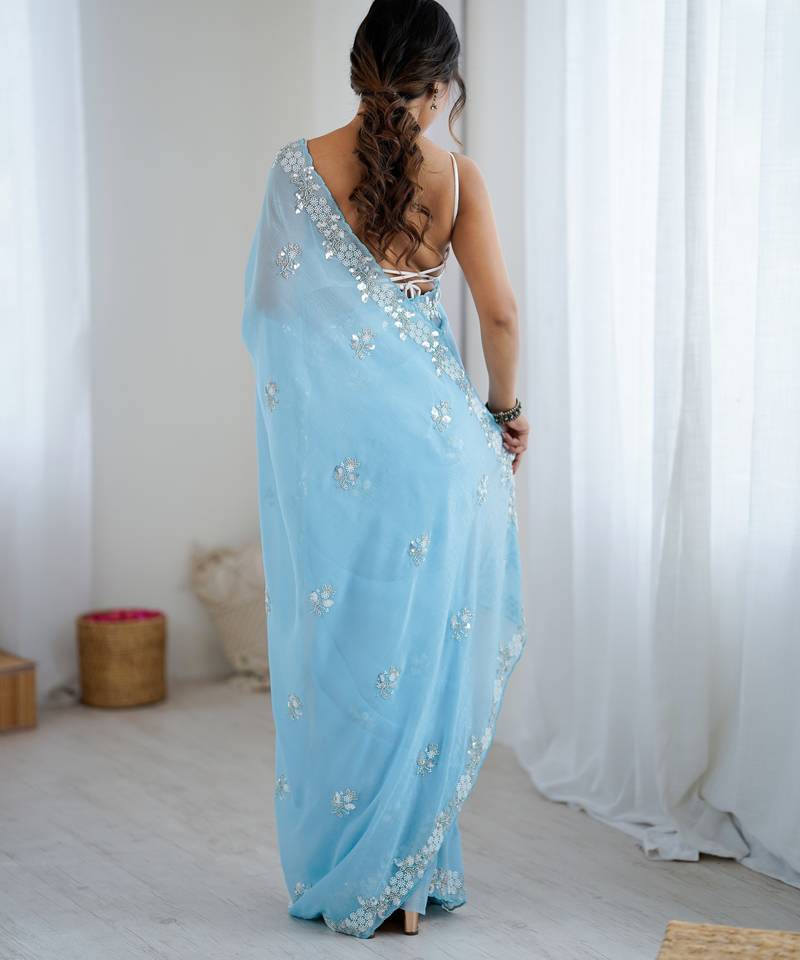 Sky blue color chiffon crush fabric heavy designer work partywear saree
