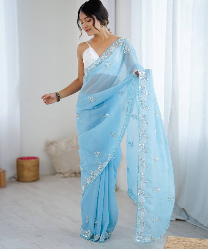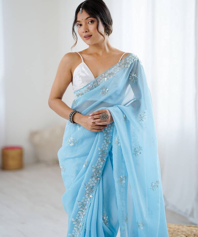 | Product Name | Sky Blue Color Chiffon Crush Fabric Heavy Designer Work Partywear Saree | |