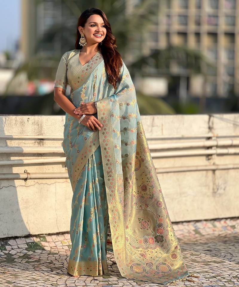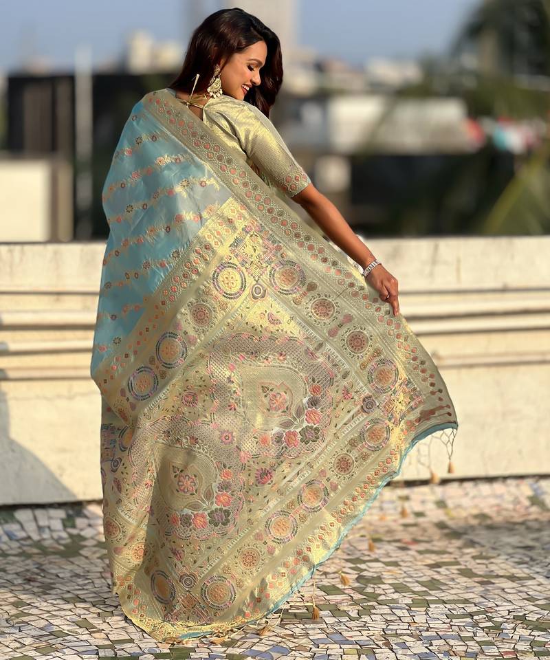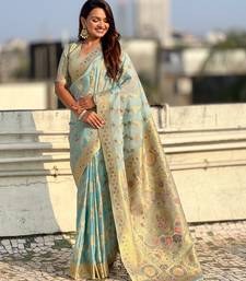 | Product Name | Sky Blue Color Kora Silk Fabric Woven Leheria Designer Saree | |