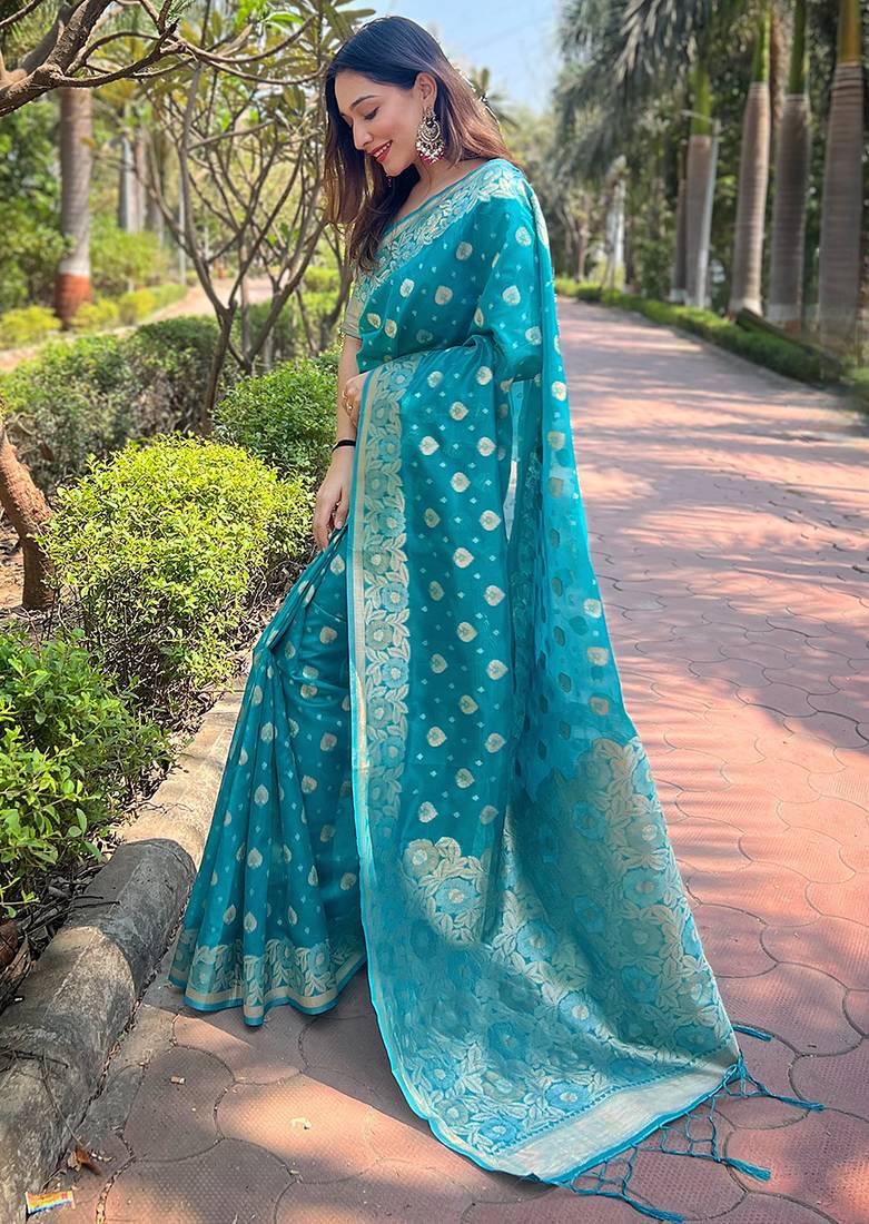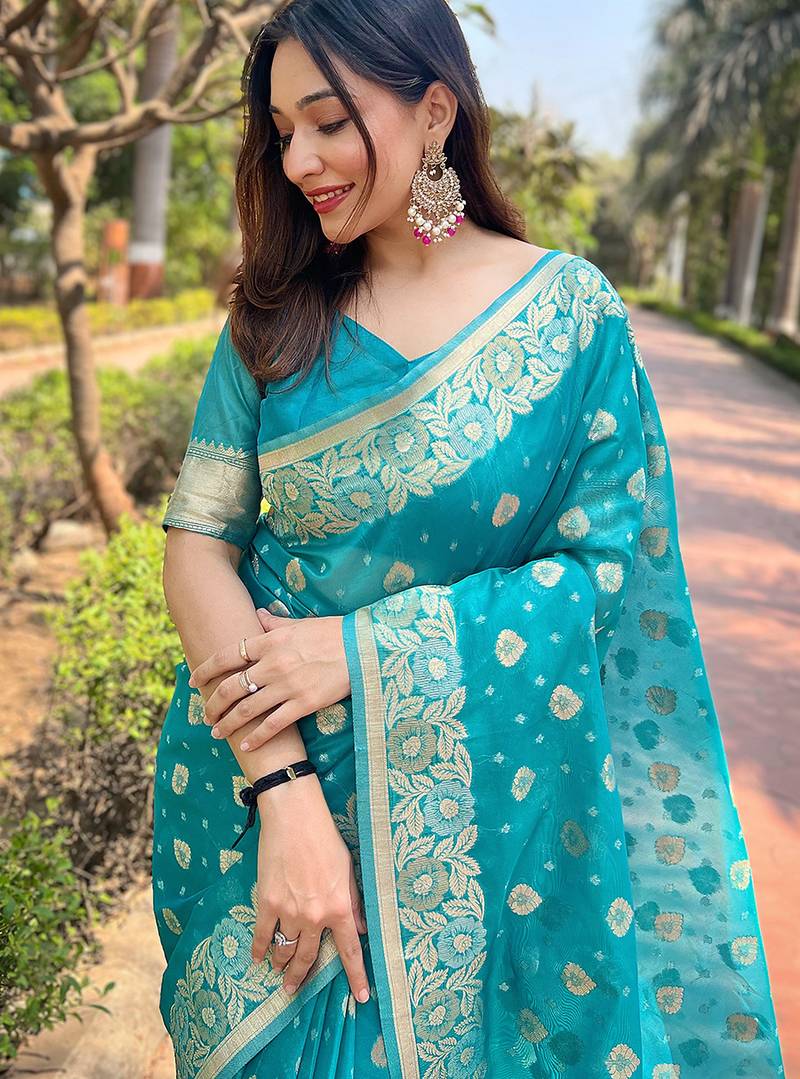 | Product Name | Sky Blue Color Organza Fabric Woven Designer Ceremonial Partywear Saree | |