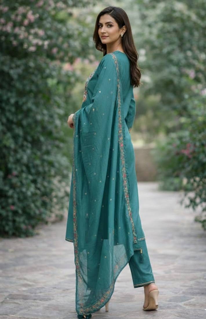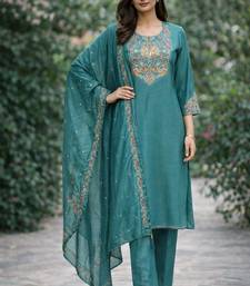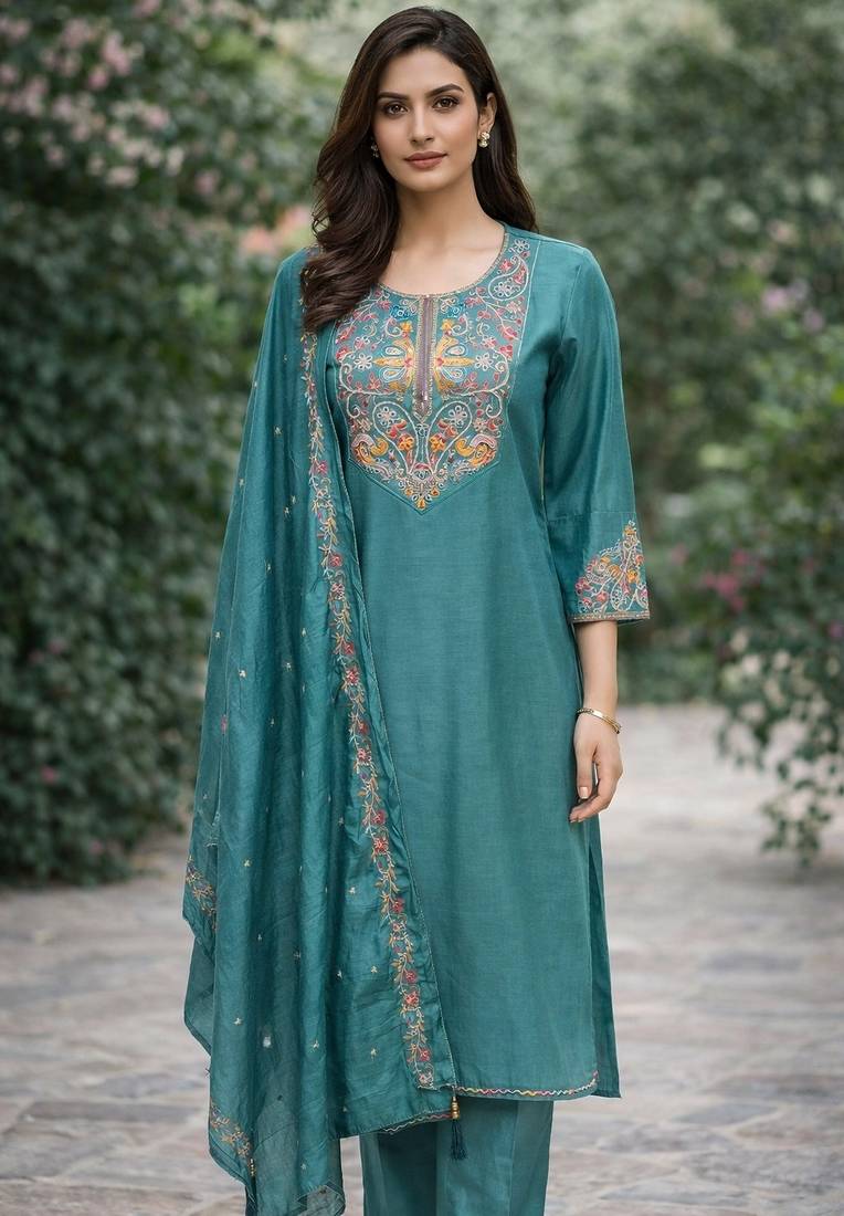 Teal blue color cotton silk fabric designer ceremonial ethnic readymade suit