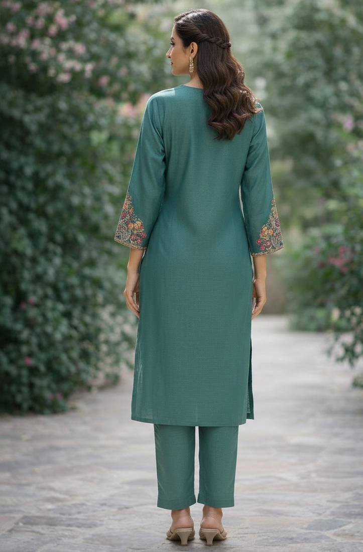 | Product Name | Teal Blue Color Cotton Silk Fabric Designer Ceremonial Ethnic Readymade Suit | |