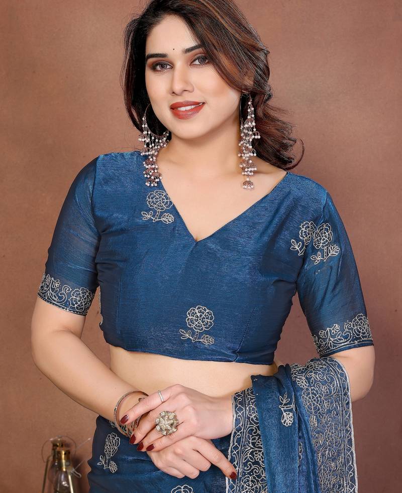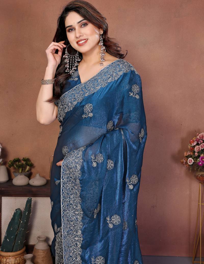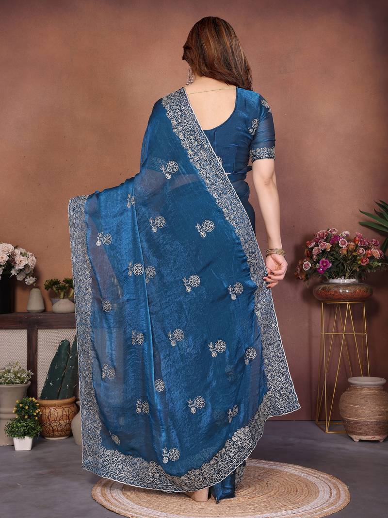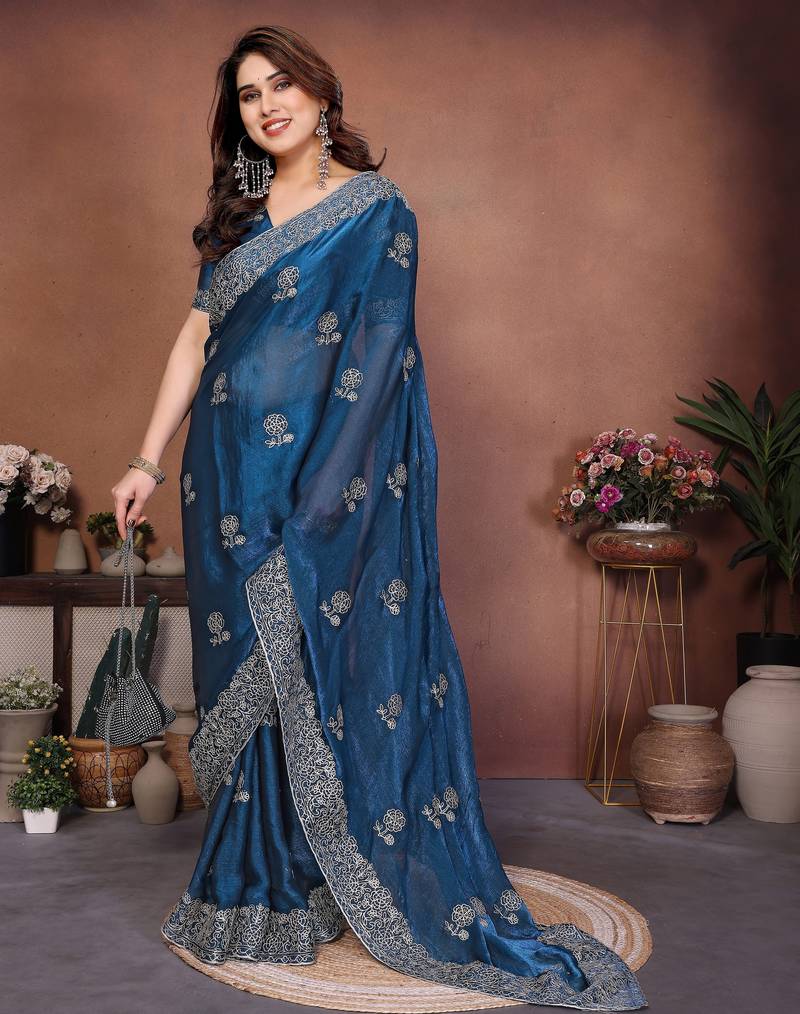 Teal blue color fendy chiffon fabric stylish bollywood style saree
